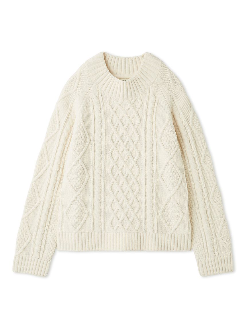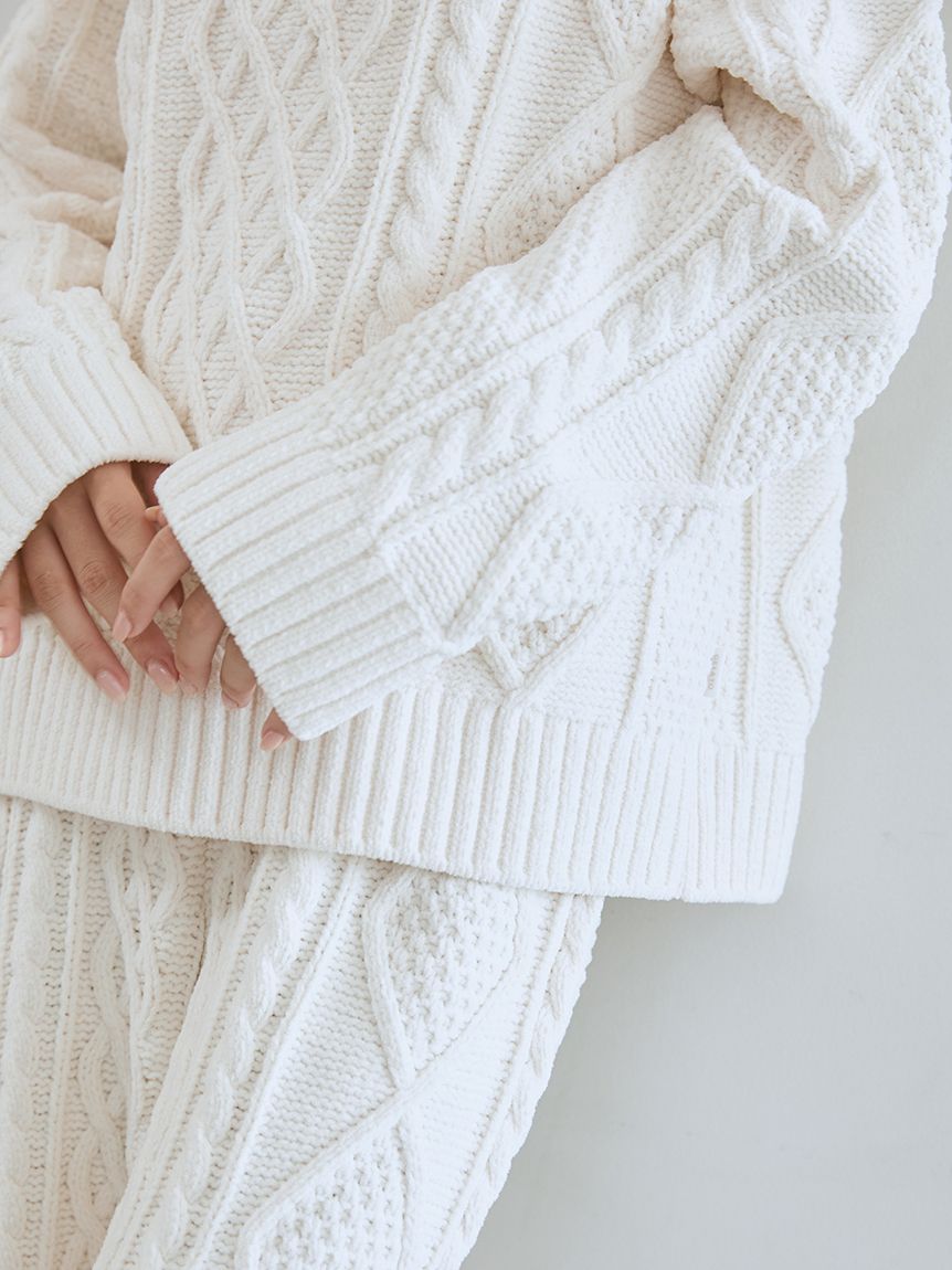 This Aran print knit series is made from soufflé material, offering a comfortable, light and bouncy feel. This pullover features a wide collar and raglan sleeves. The long length extends to the hips for a cute look. Available in easy-to-match ivory and gray, this item can be paired with the matching long pants from the same collection.