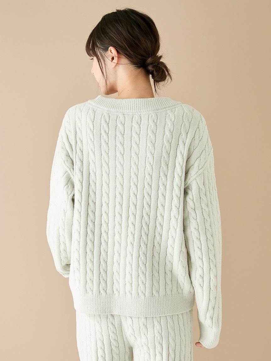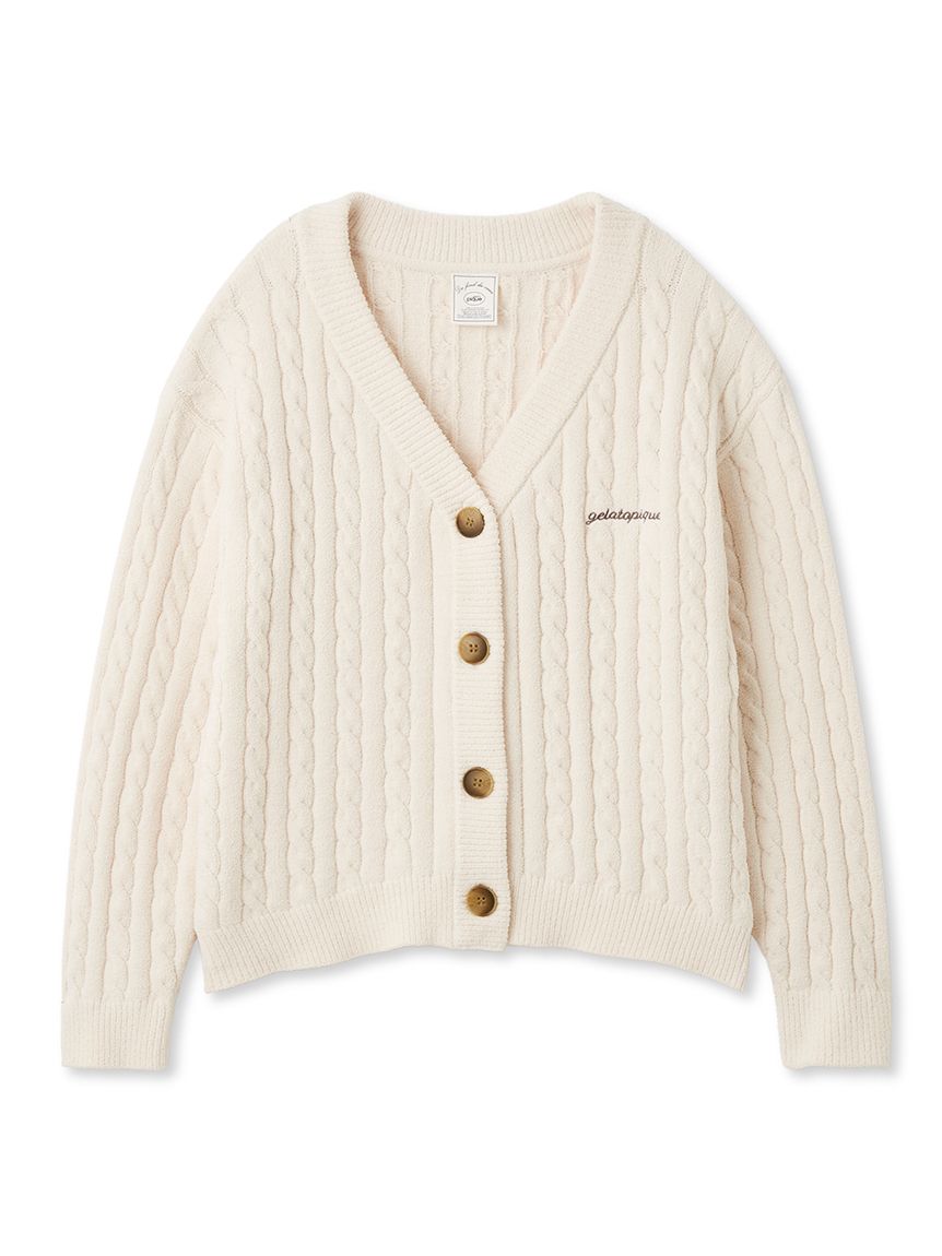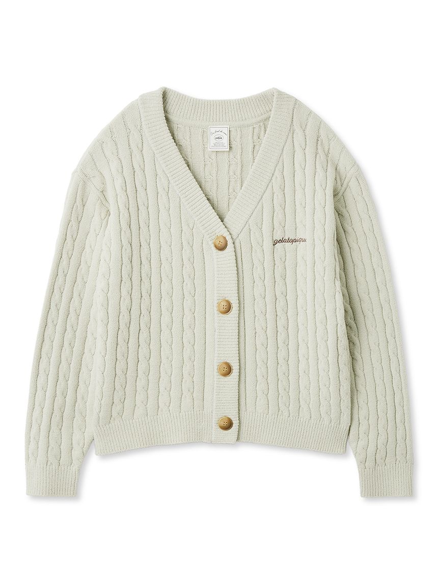 This Aran-patterned knitwear series features the smooth, comfortable 'Airy Moco' fabric, offering a lightweight feel. This cardigan's relaxed silhouette makes it perfect for a spring-ready outer layer. The clean striped pattern makes it easy to wear. The buttons and logo embroidery on the chest create a stylish, crisp look. Available in three spring-inspired colors: ivory, mint, and blue, pair it with the bustier and bottoms from the same series.
