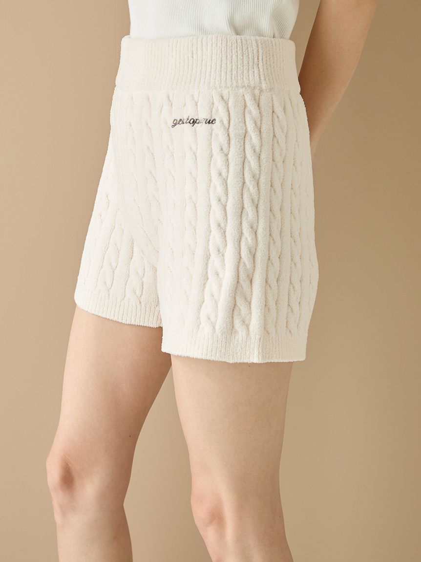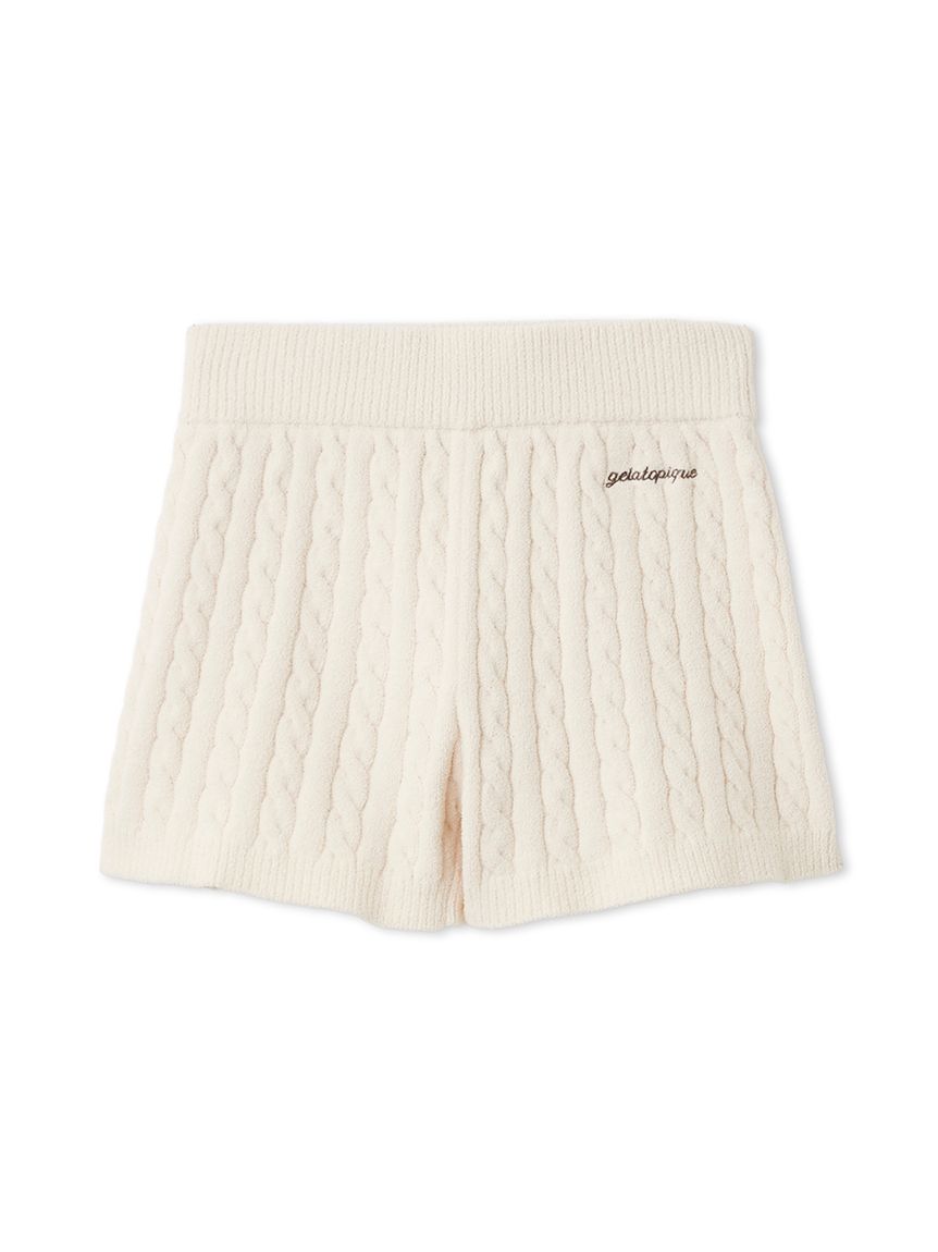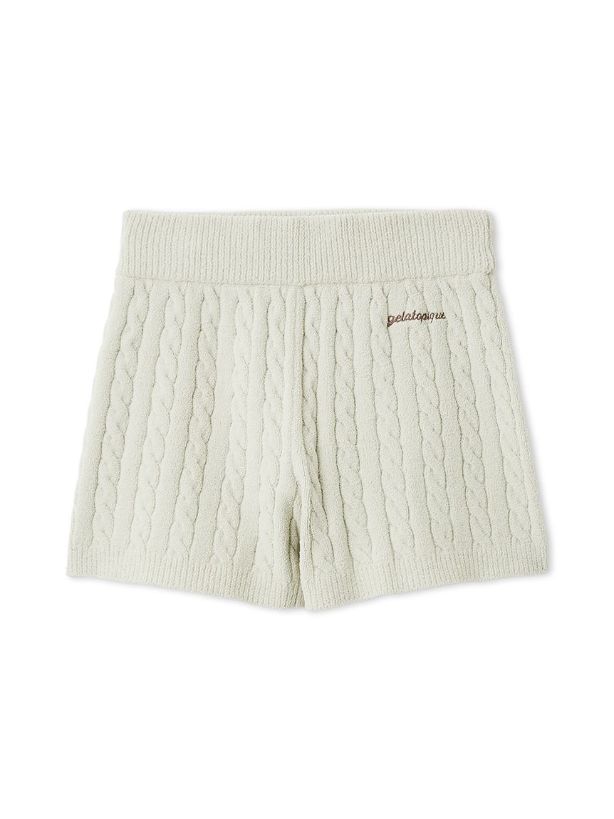 This Aran print knitwear series features a lightweight, comfortable 'Airy Moco' fabric, which feels smooth against the skin. These shorts feature a modern, fitted silhouette. The clean striped pattern allows for a compact fit, when a logo embroidery on the left hip adds a stylish touch. Available in three spring-inspired colors: ivory, mint, and blue, pair them with the cardigan and bustier of the same series.