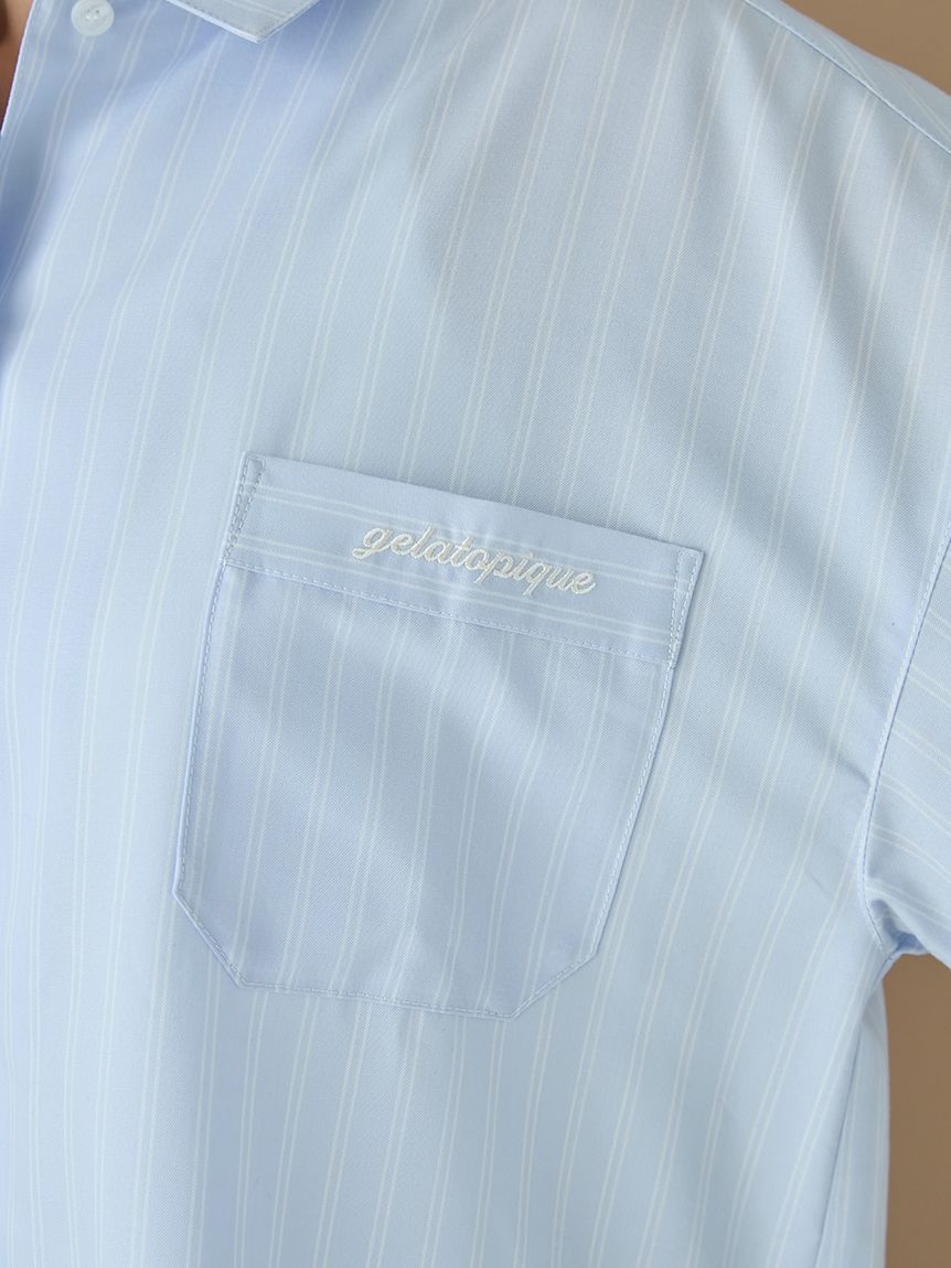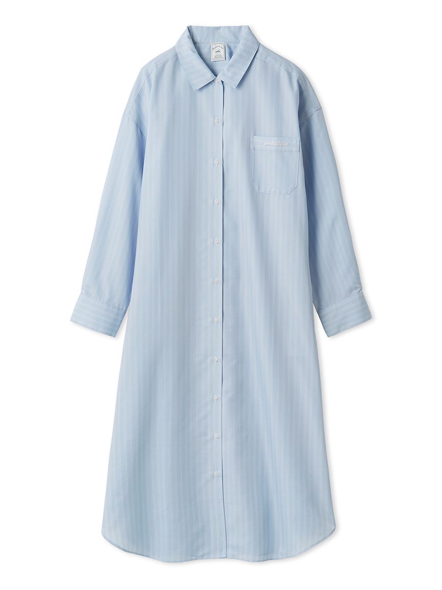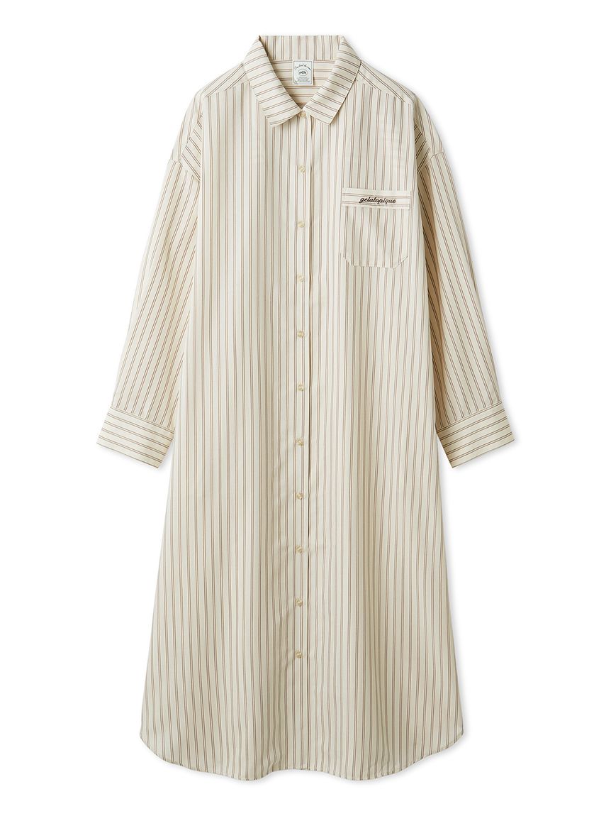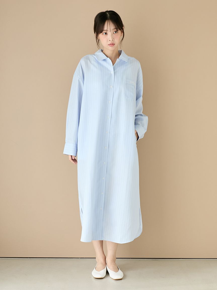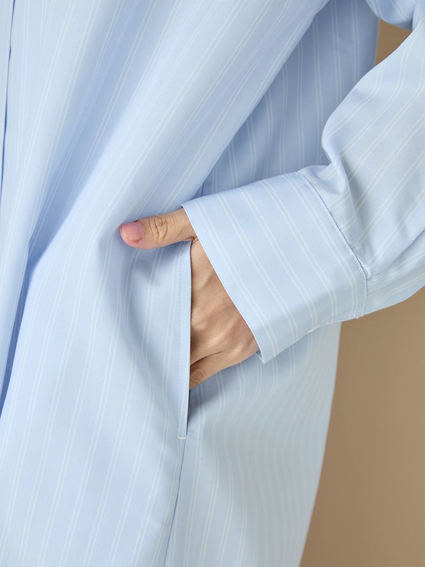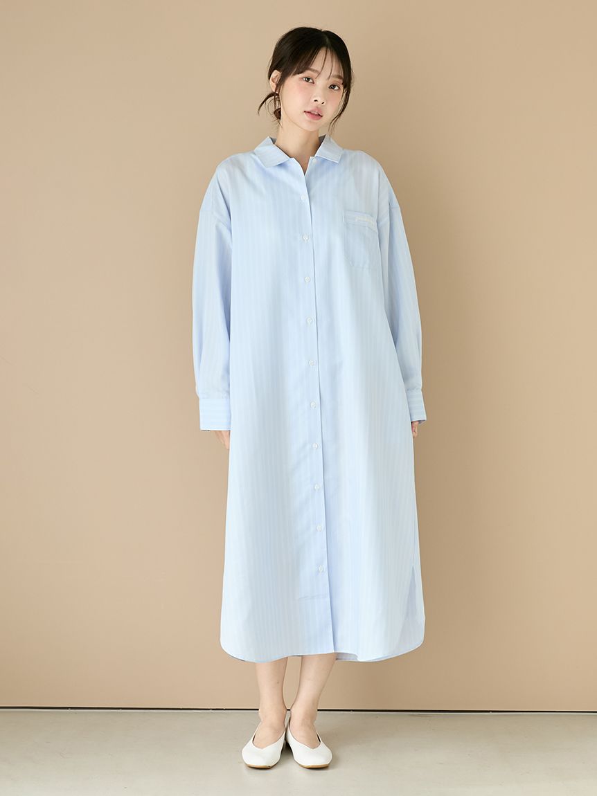 This woven fabric series features basic fine stripes, making it easy to coordinate with everyday loungewear. This shirt dress features a relaxed, oversized fit and cuffs. The long length allows for a subtle, understated look, making it suitable for wearing as a light jacket. The embroidered logo on the chest pocket adds a subtle accent. Its soft, smooth texture is also a highlight. Available in two colors: a sophisticated, subdued ivory and a refreshing blue perfect for spring.