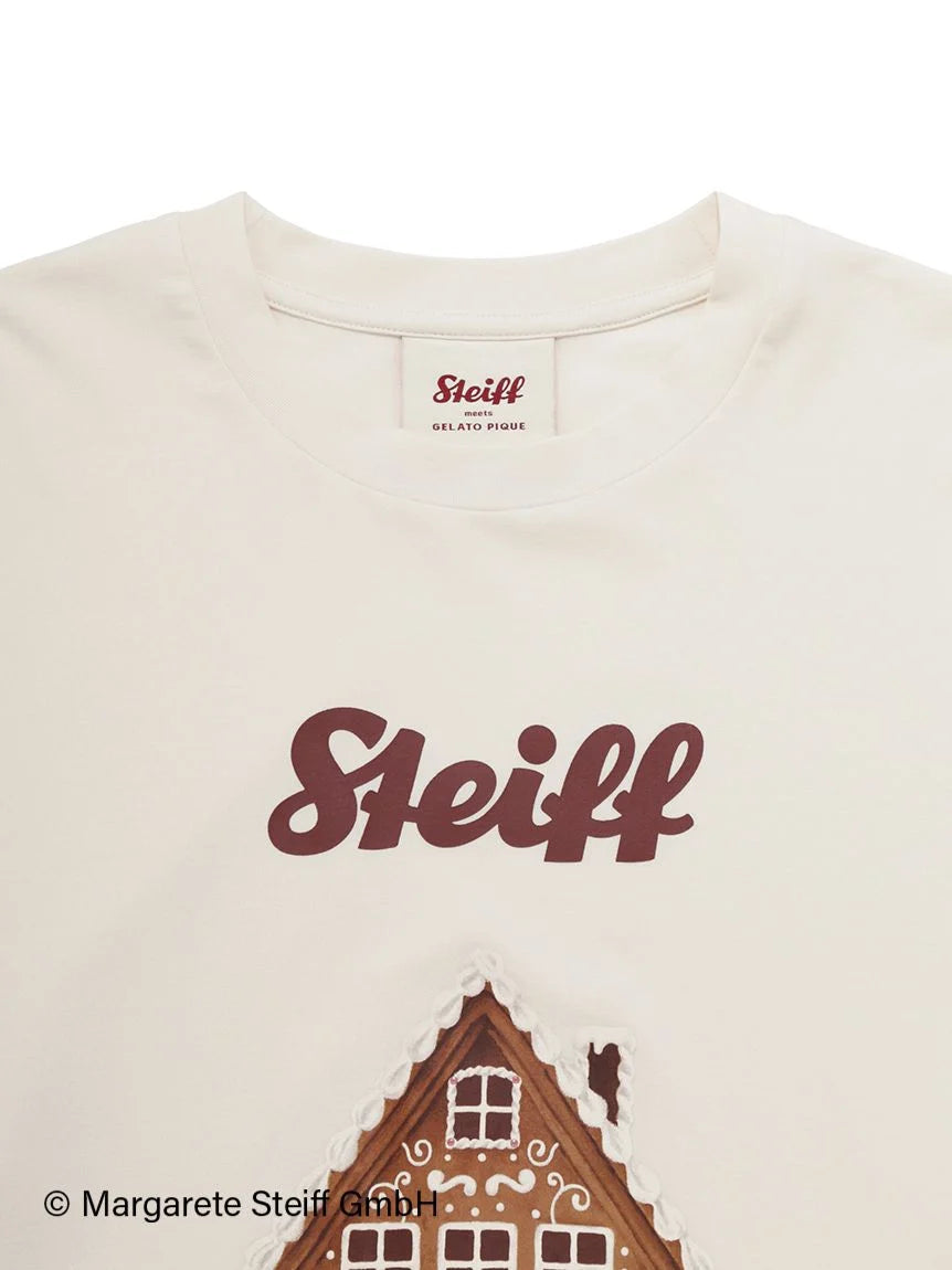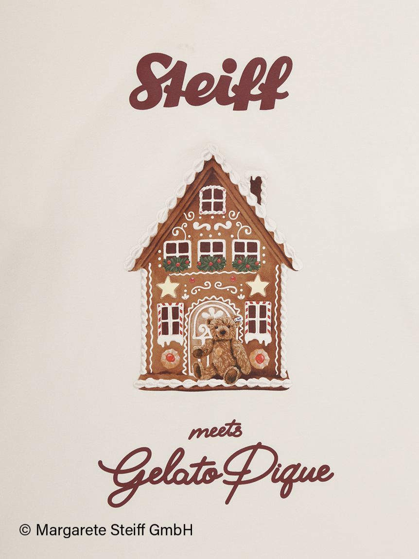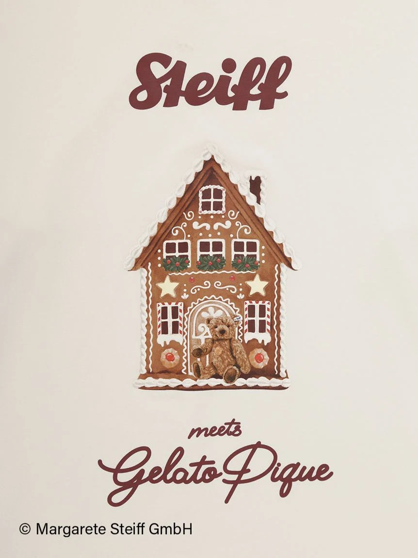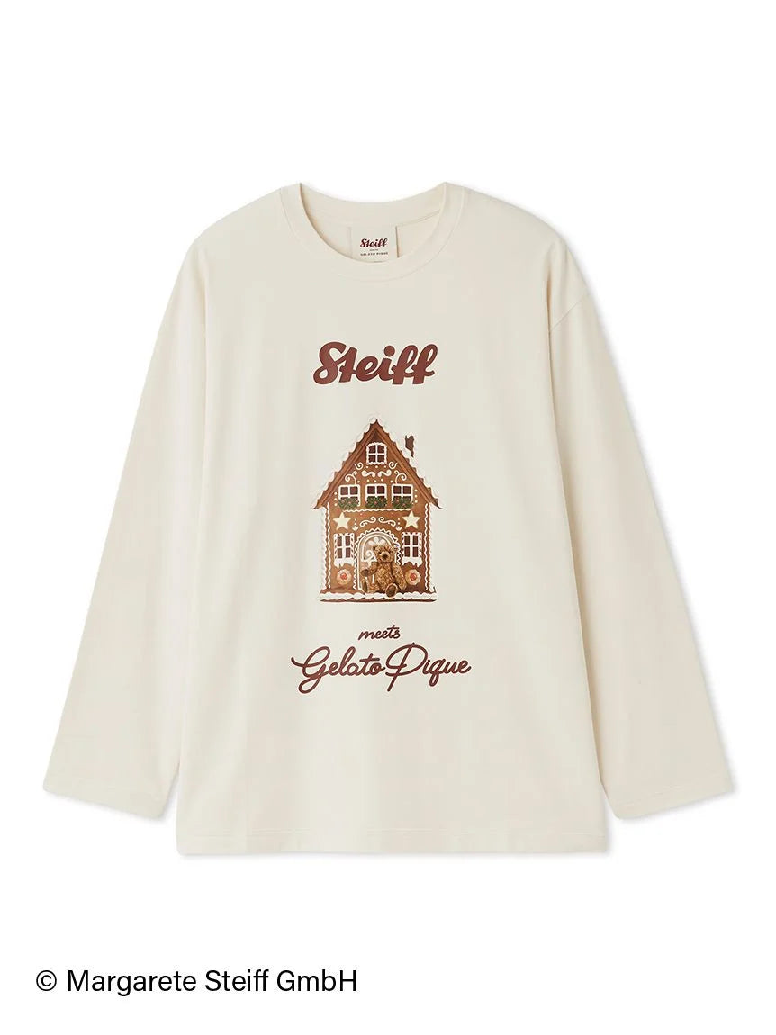 The long-awaited third collaboration series between Steiff, the renowned teddy bear brand, and gelato pique has arrived. This time, the theme is "Hexenhaus" (candy house), reminiscent of Christmas in Germany, where Steiff was born. This men's long-sleeved T-shirt features a large print of a delicious gingerbread house. A closer look reveals the world's first teddy bear, "55PB" created by Steiff in 1902, sitting in front of the house. The two brand logos adds a special touch to the design. We recommend pairing it with the all-over print long pants from the same collection.