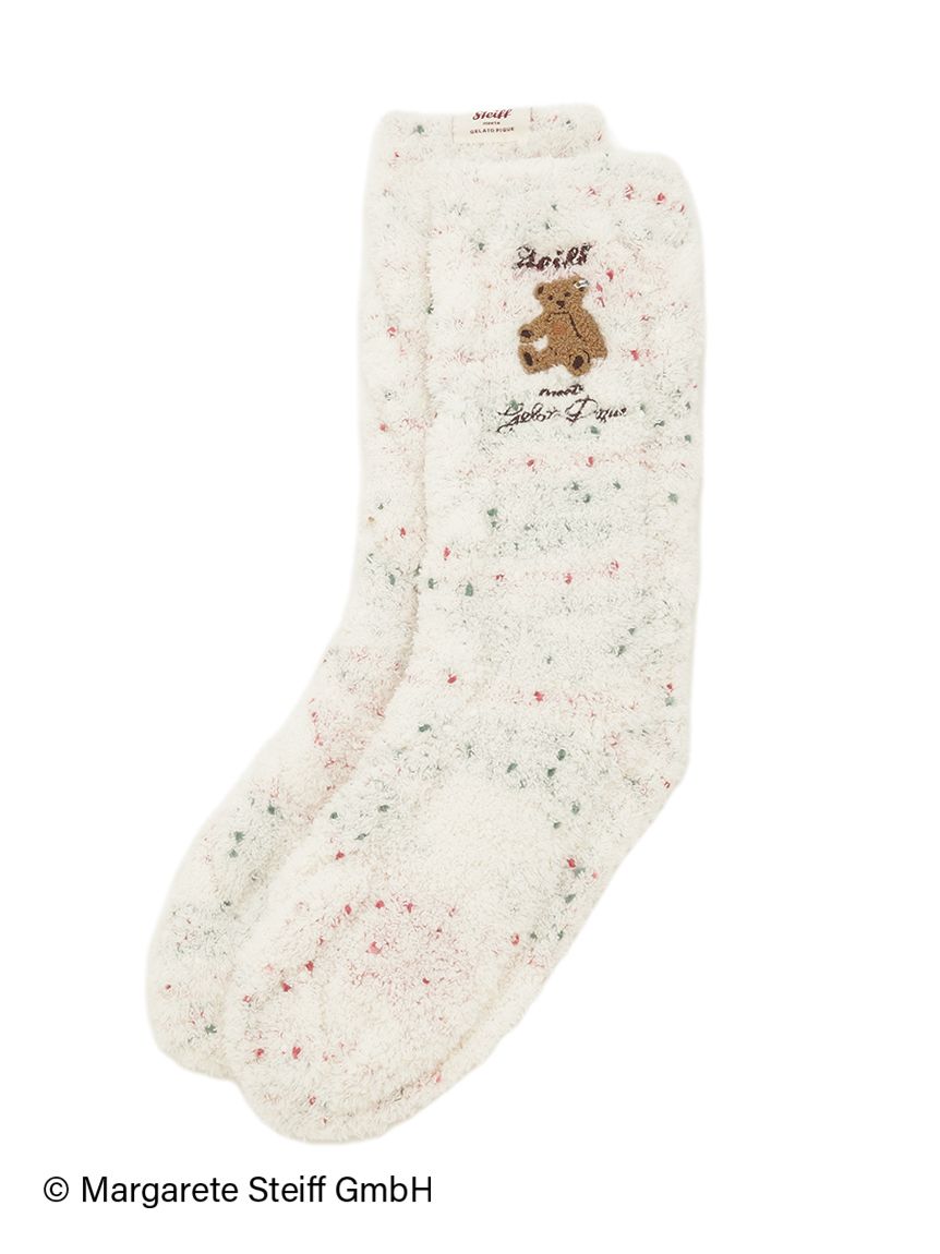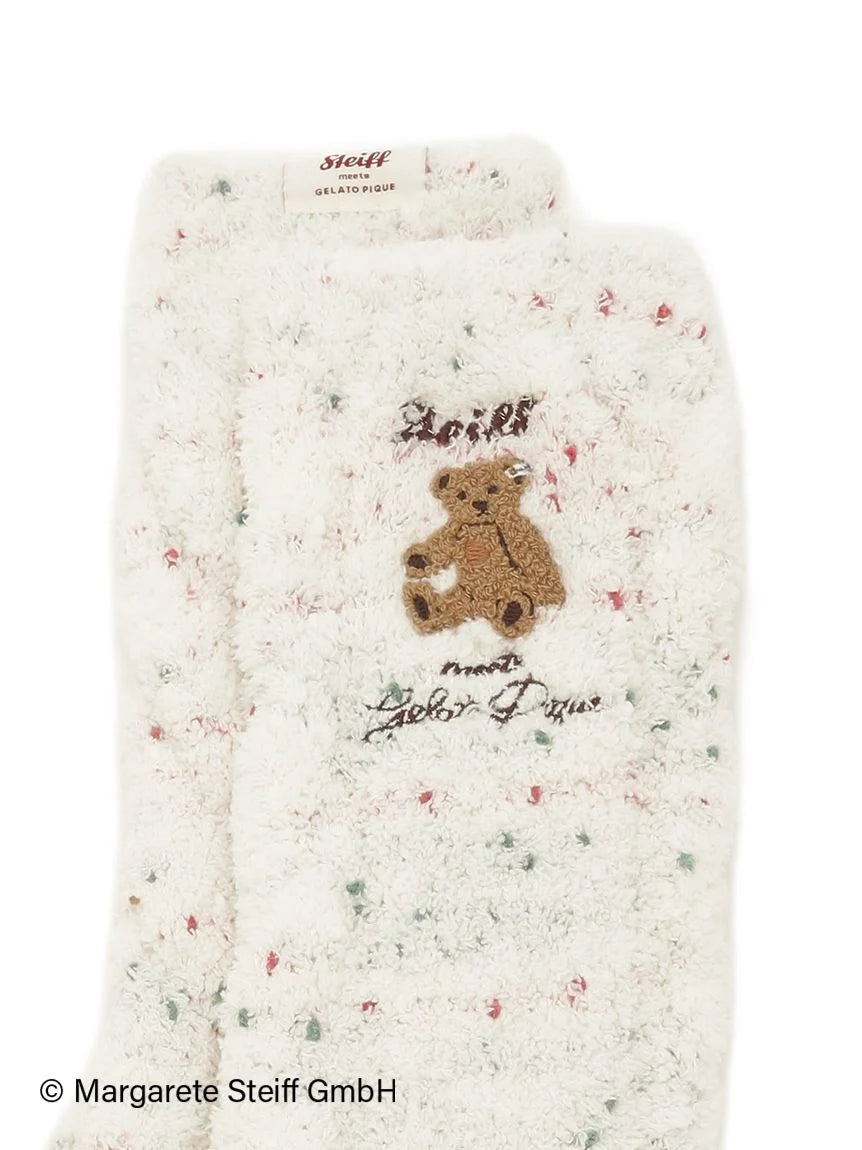 The long-awaited third collaboration series between Steiff, the renowned teddy bear brand, and gelato pique has arrived. This time, the theme is "Hexenhaus" (candy house), reminiscent of Christmas in Germany, where Steiff was born. These "powder" socks with colored neps are inspired by sweet Christmas treats. The fluffy Aran knit features a Sagara embroidery of the world's first teddy bear, the "55PB" created by Steiff in 1902. The powdery touch of these shoes envelops your feet, like powdered sugar. Available in three colors: cream, pink, and green, this item is perfect for coordinating with other items from the collaboration series, or as a heartwarming winter gift.