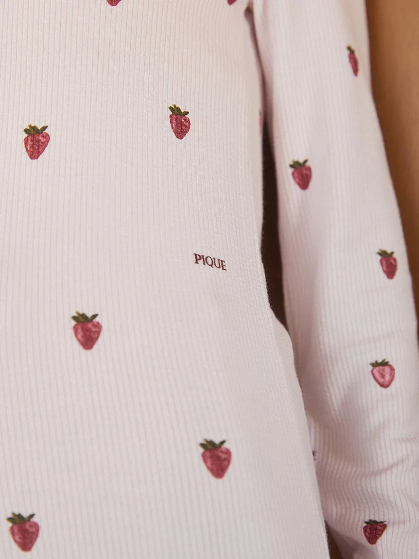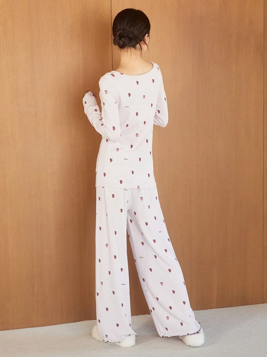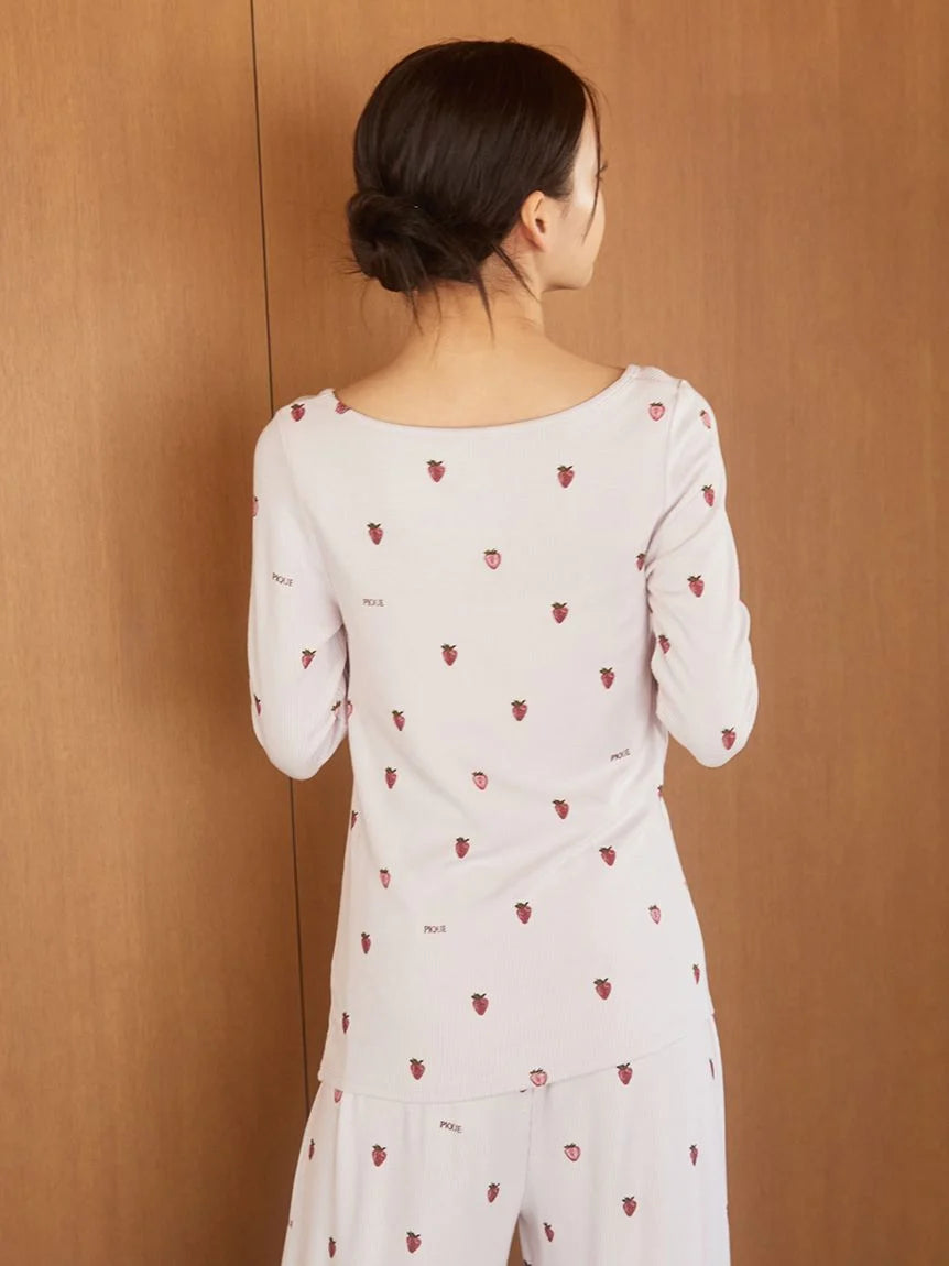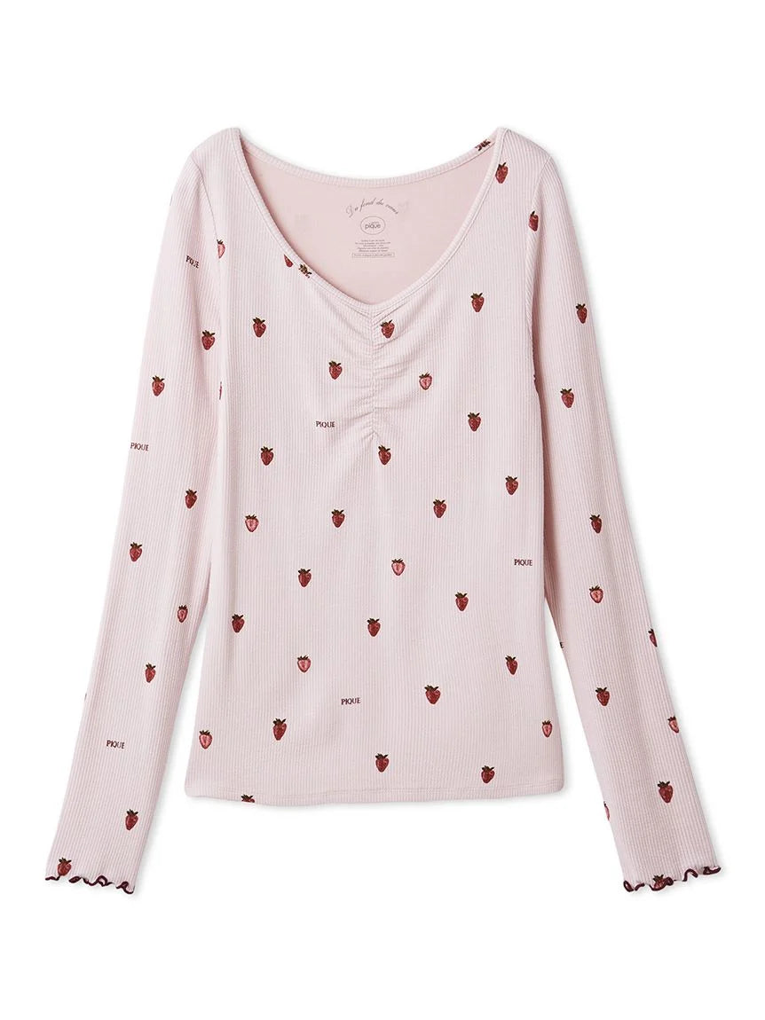 This soft ribbed long-sleeved T-shirt features a subtle, sophisticated strawberry pattern. Crafted with warm HOT FABRIC, it's comfortable to wear even in the coldest of weather. Available in two colors: a cute, sophisticated pink and a chic navy, we recommend pairing it with the matching long pants.
