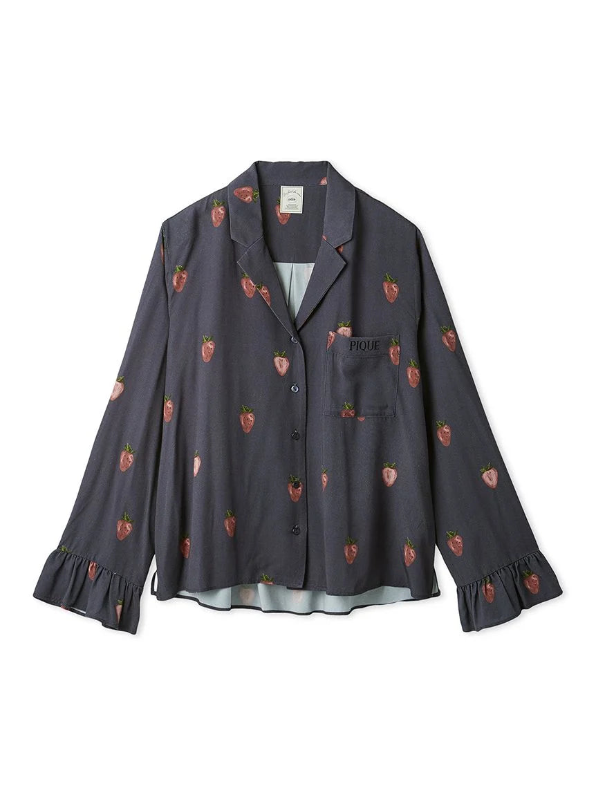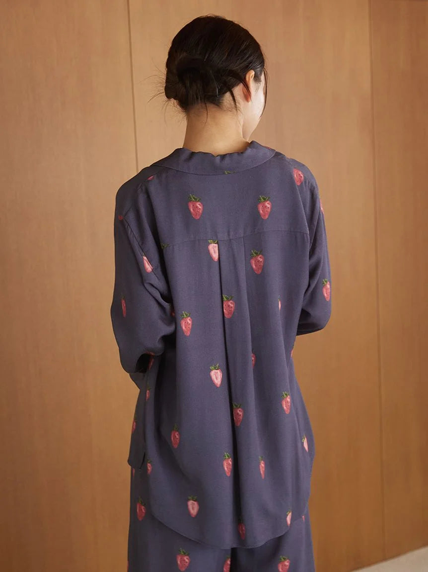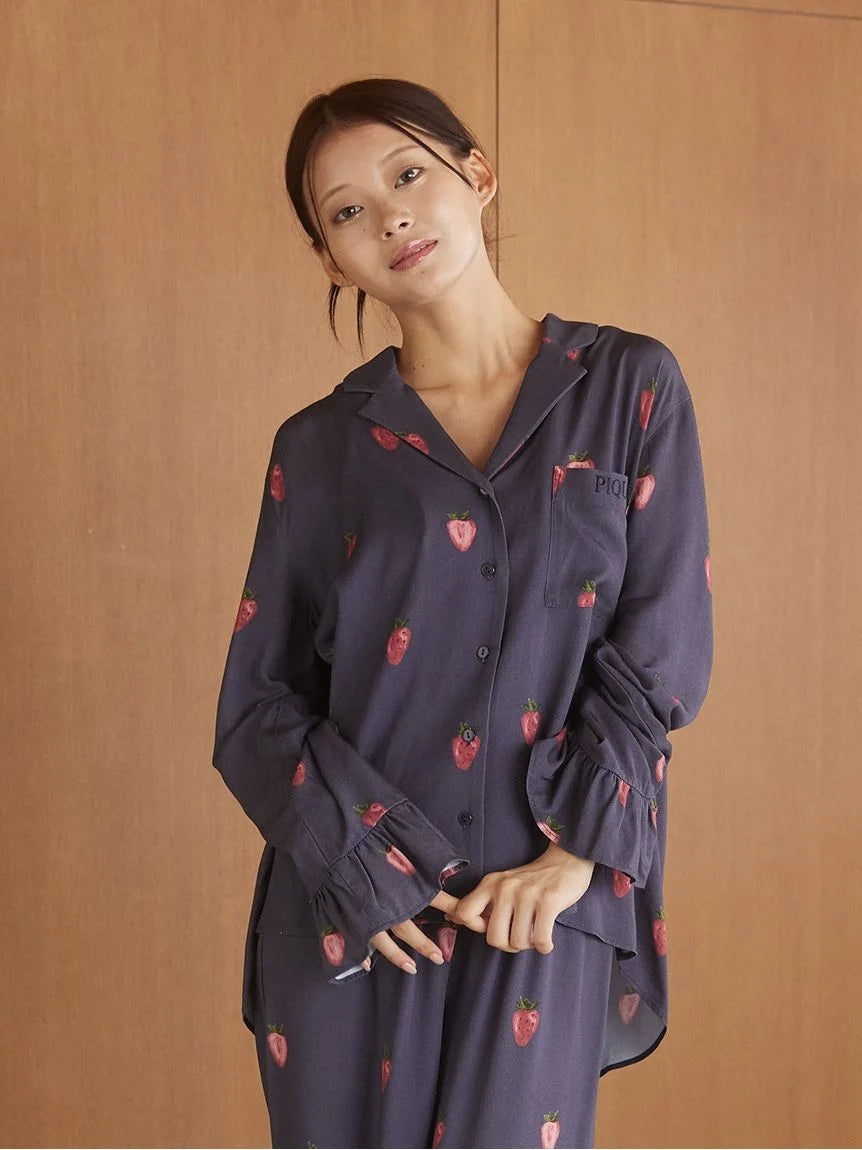 This twill shirt features a strawberry pattern that realistically depicts the juicy texture of the fruit, creating a sophisticated look. The front and back hems create a relaxed, feminine silhouette. The PIQUE logo is embroidered on the chest pocket. Available in two colors: soft pink and subdued navy, pair this item with long pants and accessories from the same collection for a sophisticated and cute look.