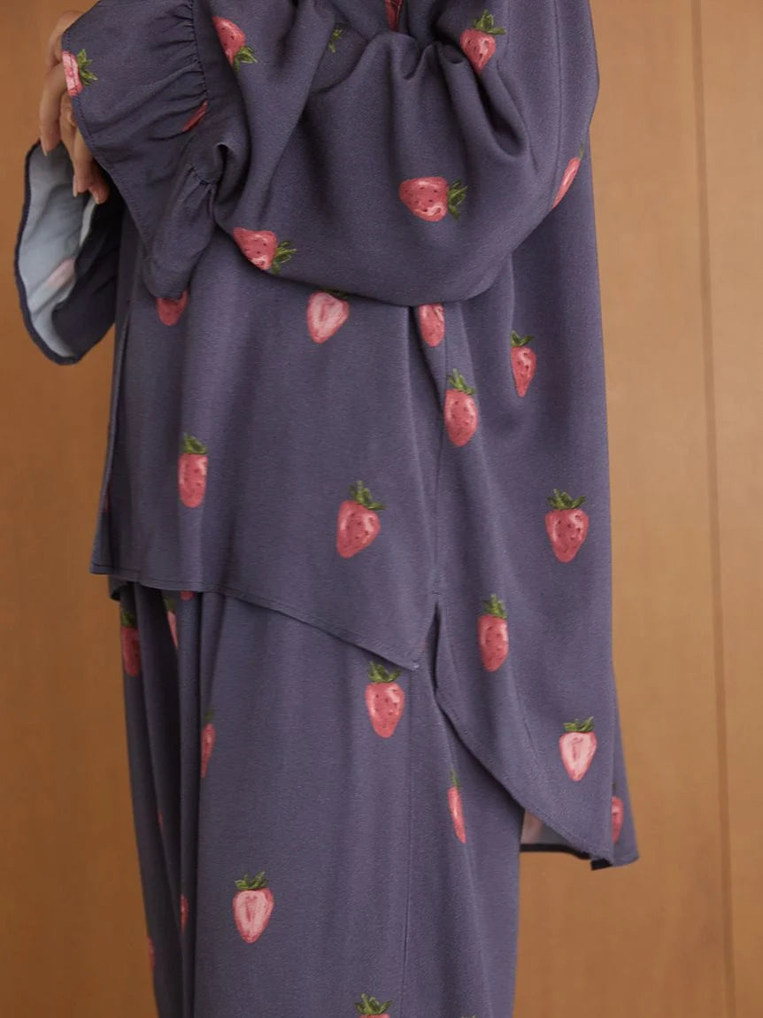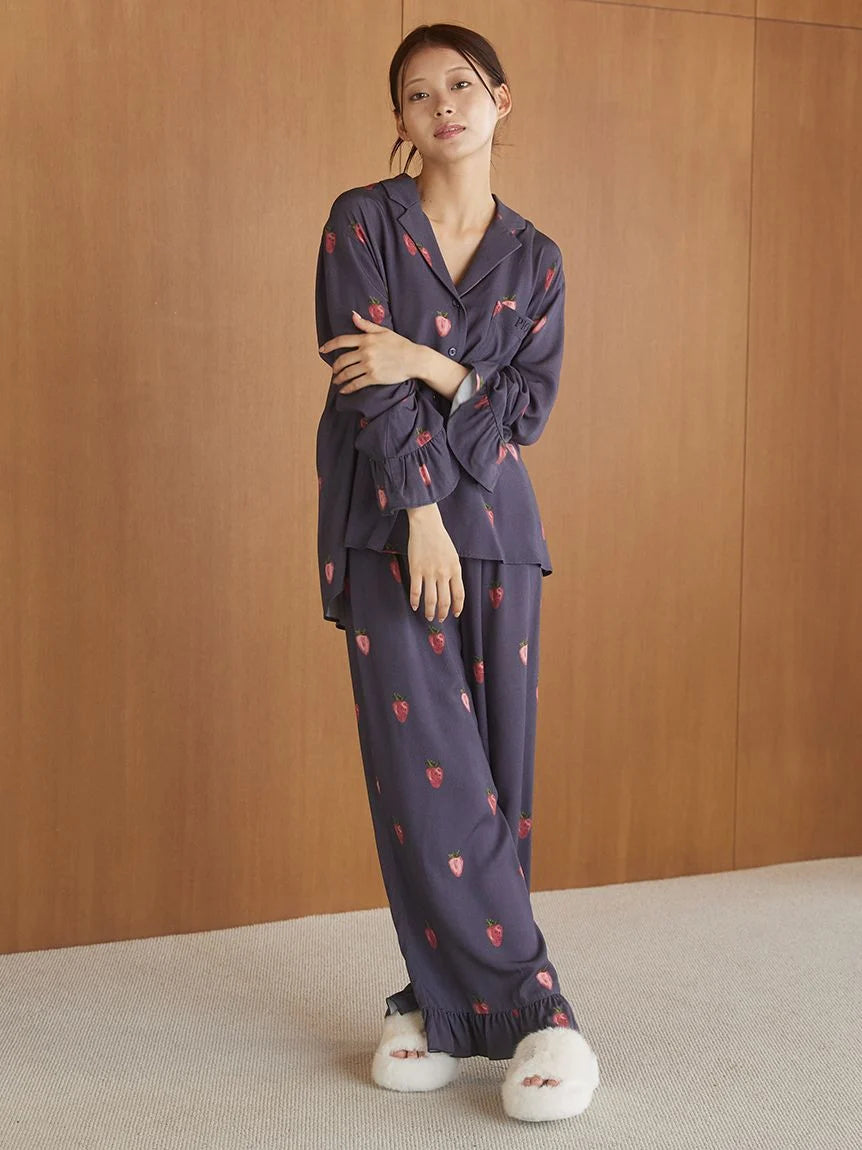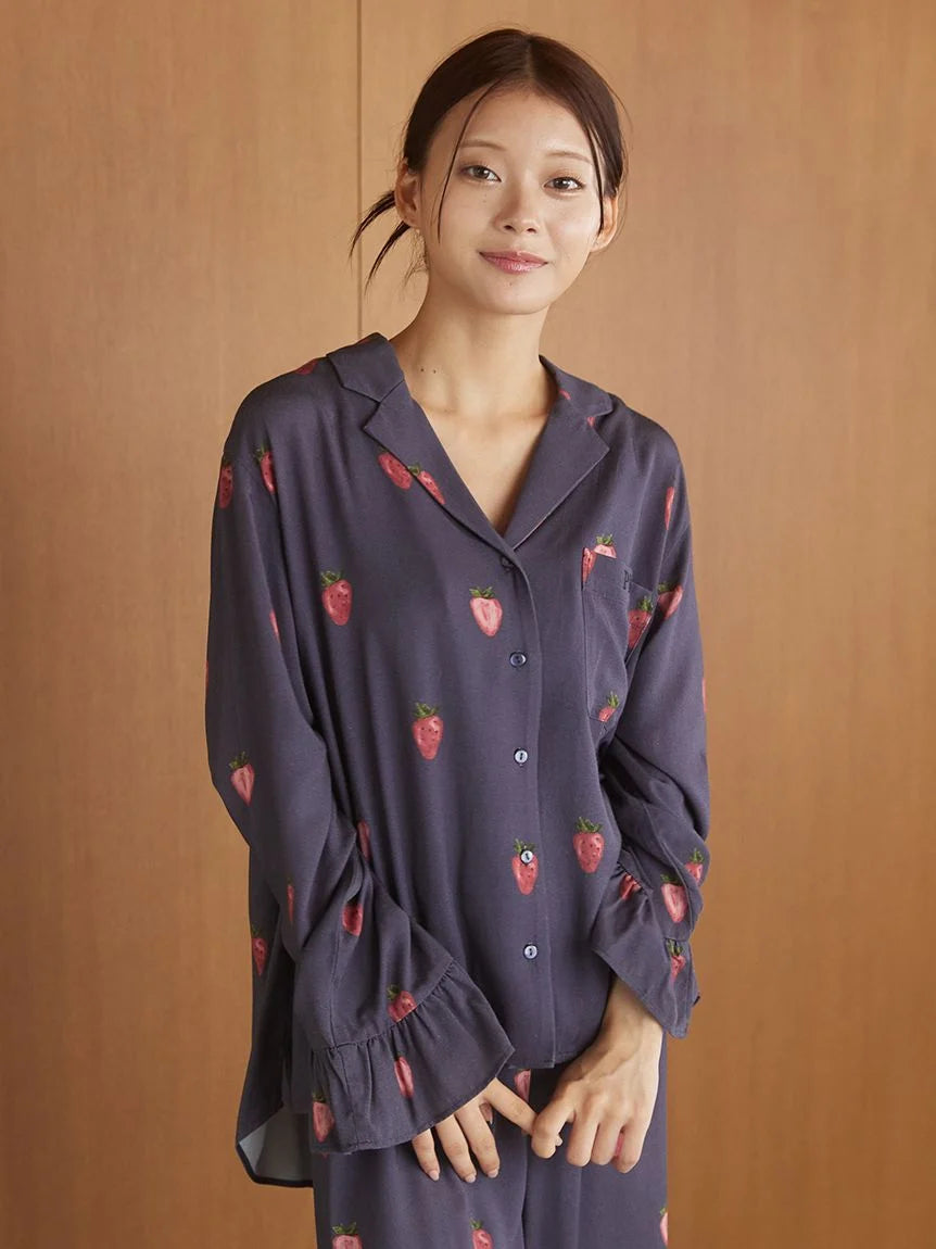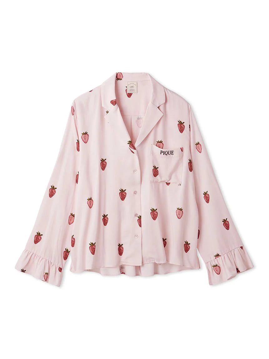This twill shirt features a strawberry pattern that realistically depicts the juicy texture of the fruit, creating a sophisticated look. The front and back hems create a relaxed, feminine silhouette. The PIQUE logo is embroidered on the chest pocket. Available in two colors: soft pink and subdued navy, pair this item with long pants and accessories from the same collection for a sophisticated and cute look.