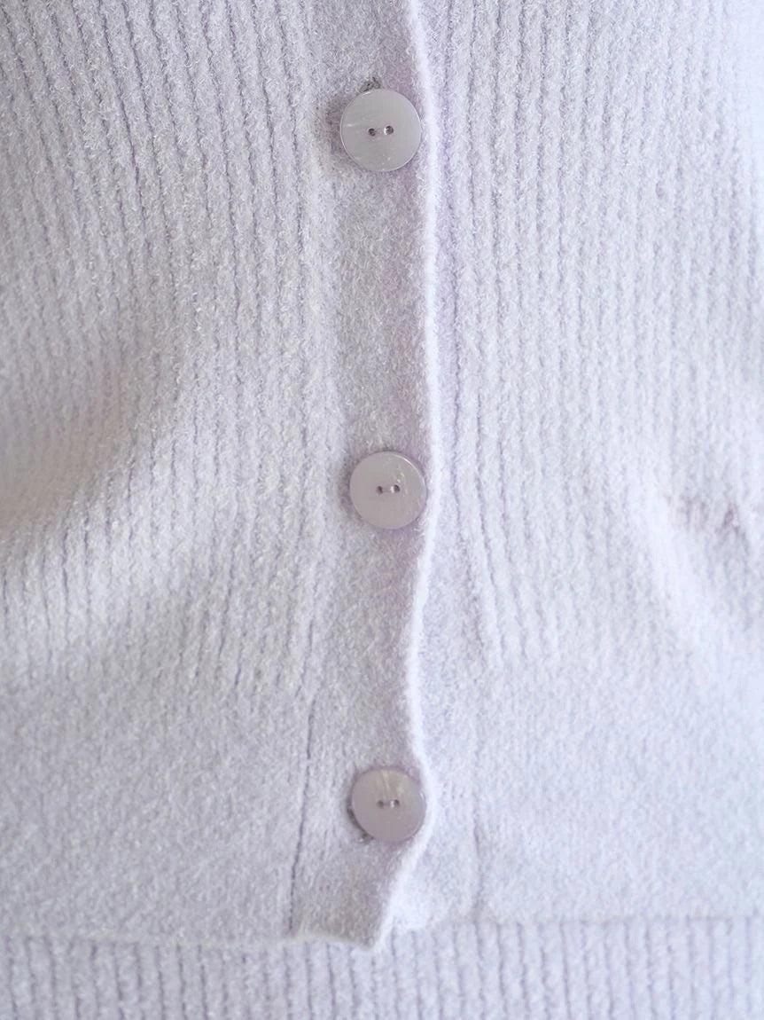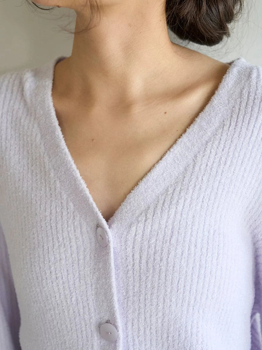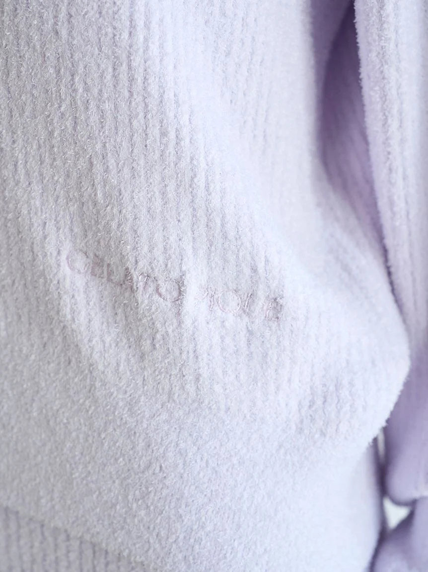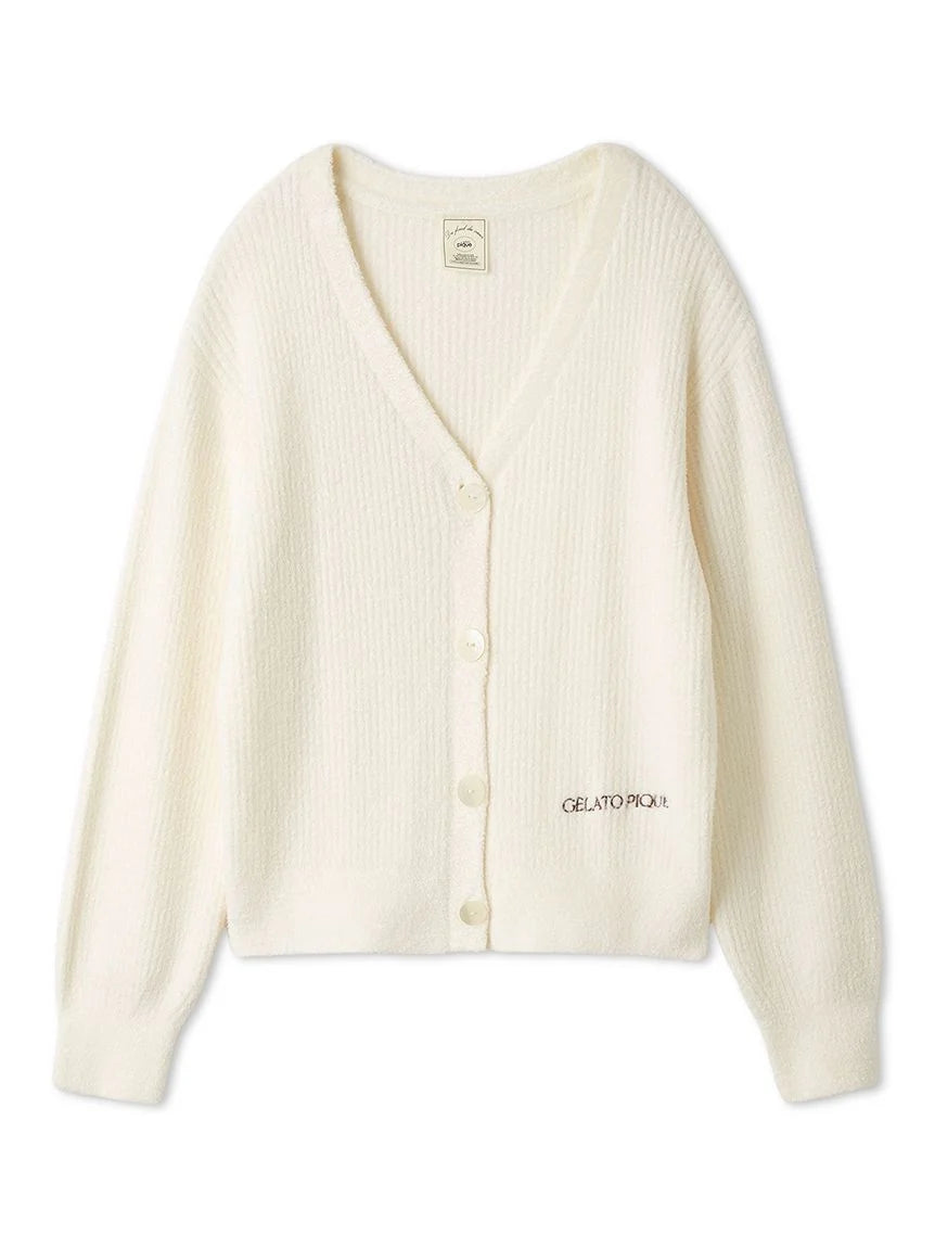 This ribbed knit series features gelato pique's signature soft colors, crafted from Hot Smoothie, a material that keeps you warm. This V-neck cardigan is easy to throw on over a dress or shirt. Its relaxed fit and cropped length make it a versatile piece, pairing well with a wide range of bottoms. The skin-toning color and smooth, narrow ribbing create an elegant look. A large logo is embroidered on the bottom left. Available in ivory and lavender. We recommend wearing it over the dress from the same collection.