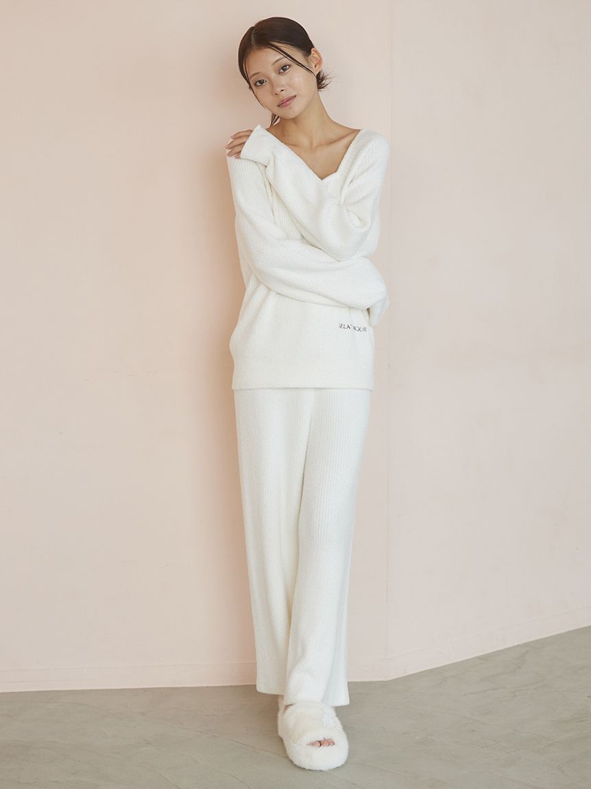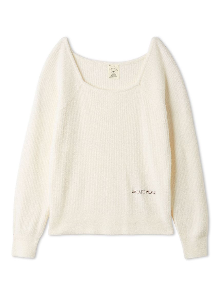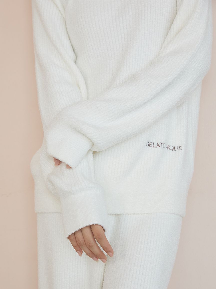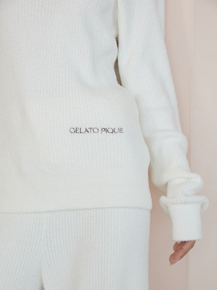 This ribbed knit series features gelato pique's signature soft colors, crafted from "Hot Smoothie" for a cozy, warm feel. This pullover features a moderately open neckline that flatters the décolleté and neck. The skin-toning color and smooth, narrow ribbing create an elegant look. It also features a large embroidered logo on the bottom left. Available in ivory and lavender, this item can be worn as a set with the long pants from the same collection.
