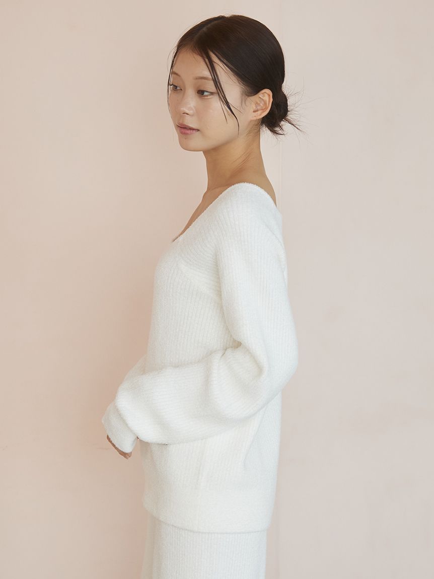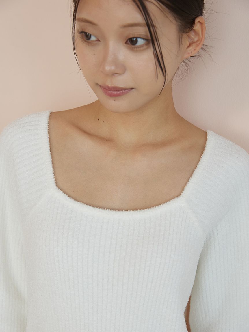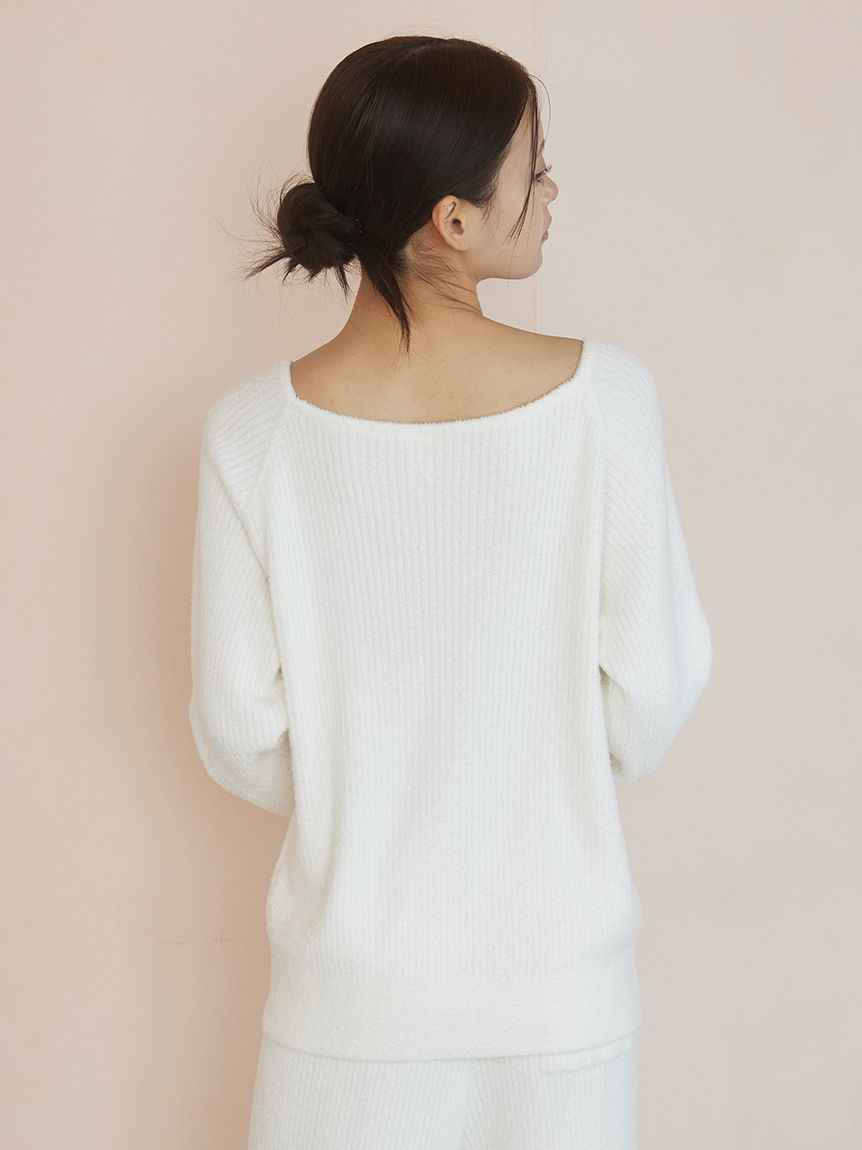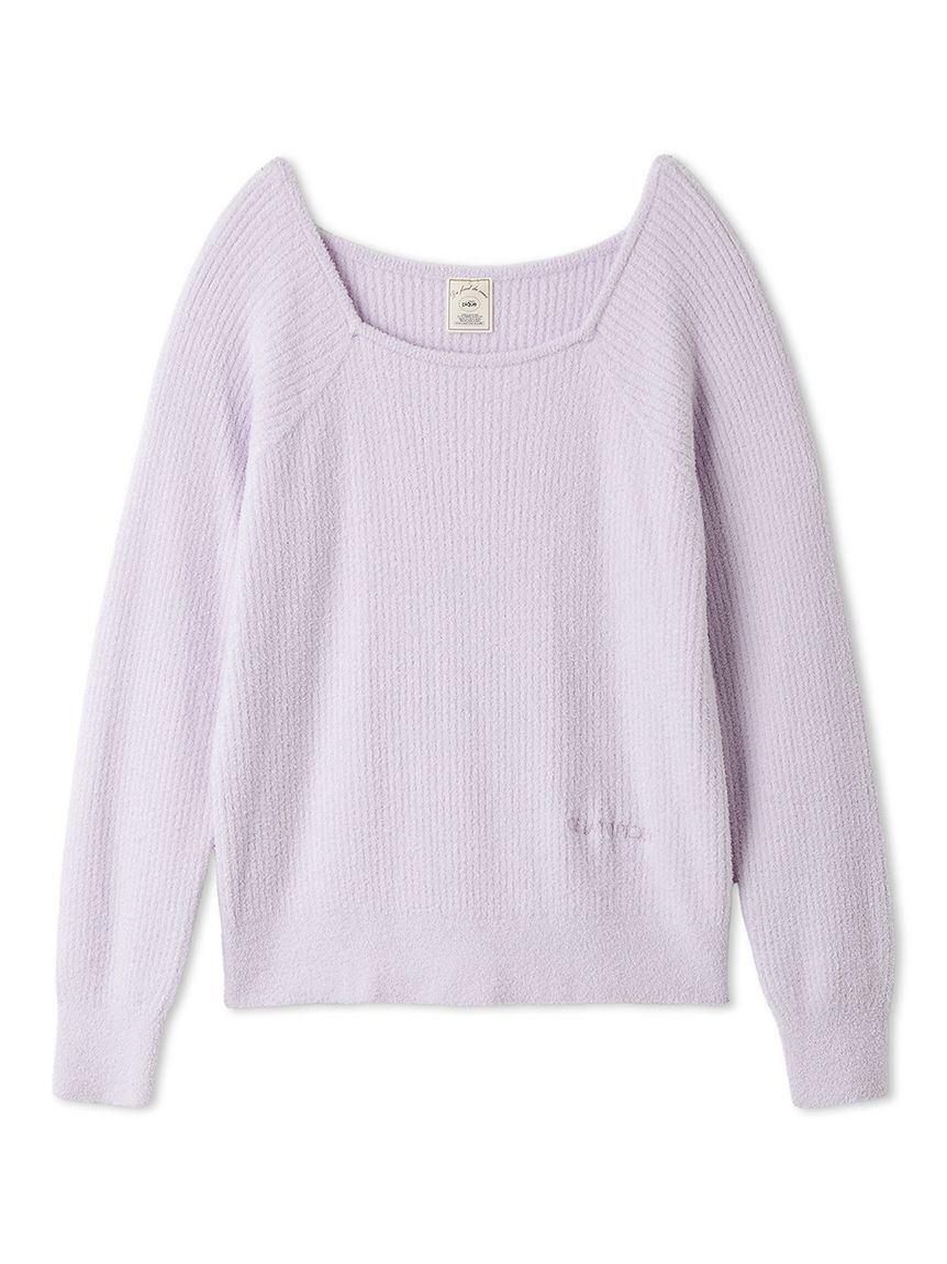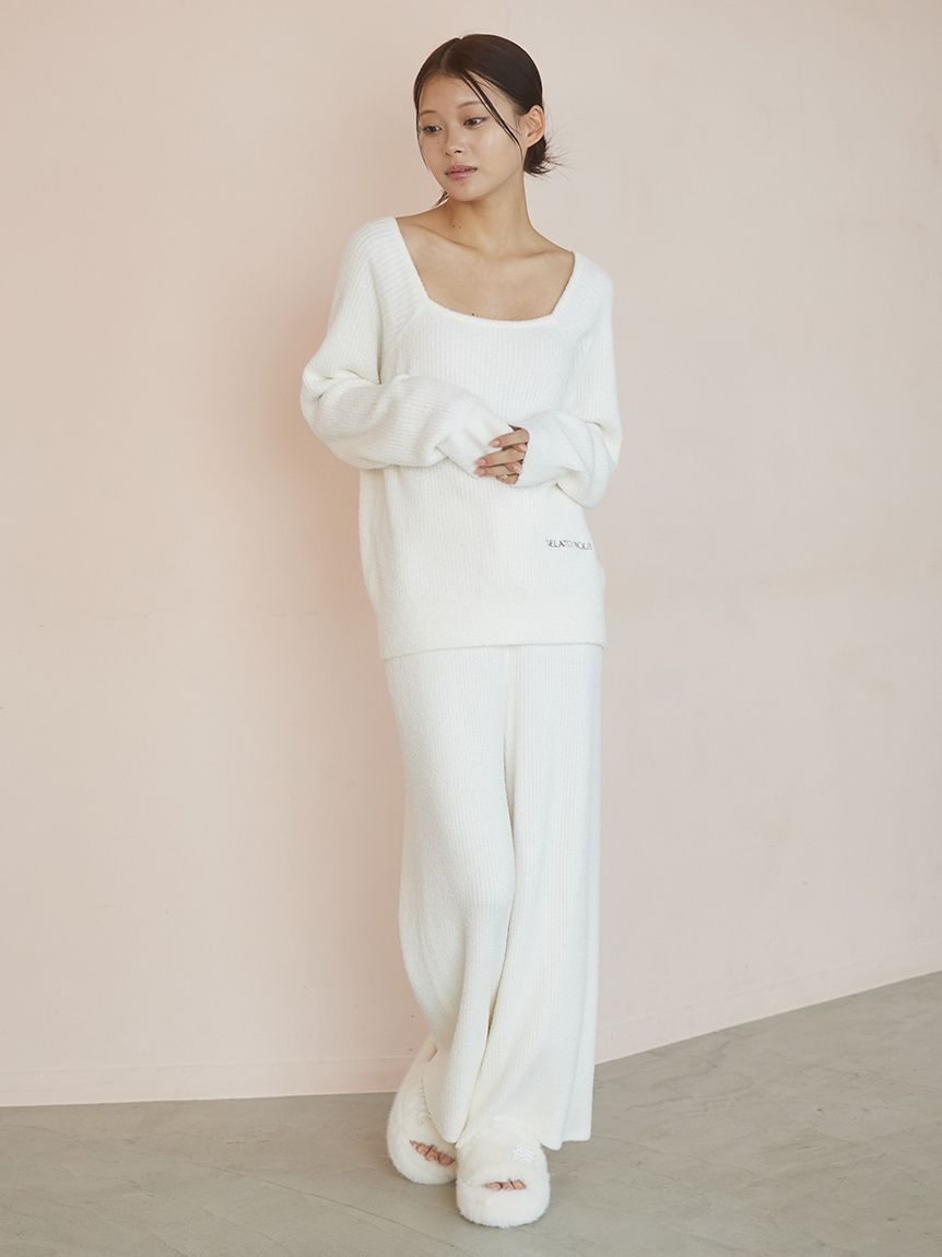 This ribbed knit series features gelato pique's signature soft colors, crafted from "Hot Smoothie" for a cozy, warm feel. This pullover features a moderately open neckline that flatters the décolleté and neck. The skin-toning color and smooth, narrow ribbing create an elegant look. It also features a large embroidered logo on the bottom left. Available in ivory and lavender, this item can be worn as a set with the long pants from the same collection.