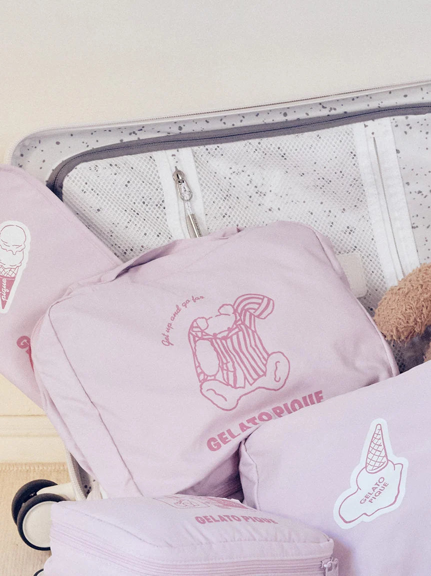 This travel storage series features striking illustrations with simple, clean lines. This medium-sized travel pouch with a handle features an adorable bear design on the front. The main compartment is divided into two sections, allowing you to separate smaller items like underwear and socks, as well as accessories. Another pocket on the back is convenient for separating used items. Available in two colors: cream and pink, don't forget to check out other travelling accessories from the same collection before you escape from work!