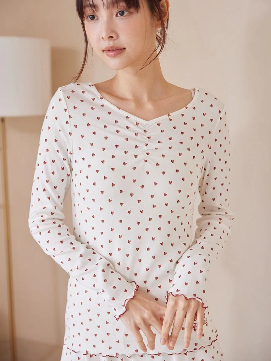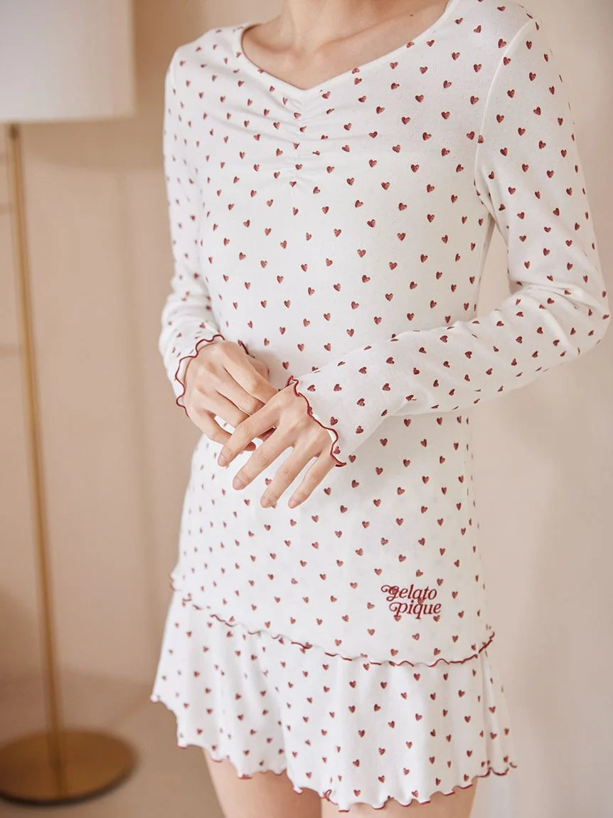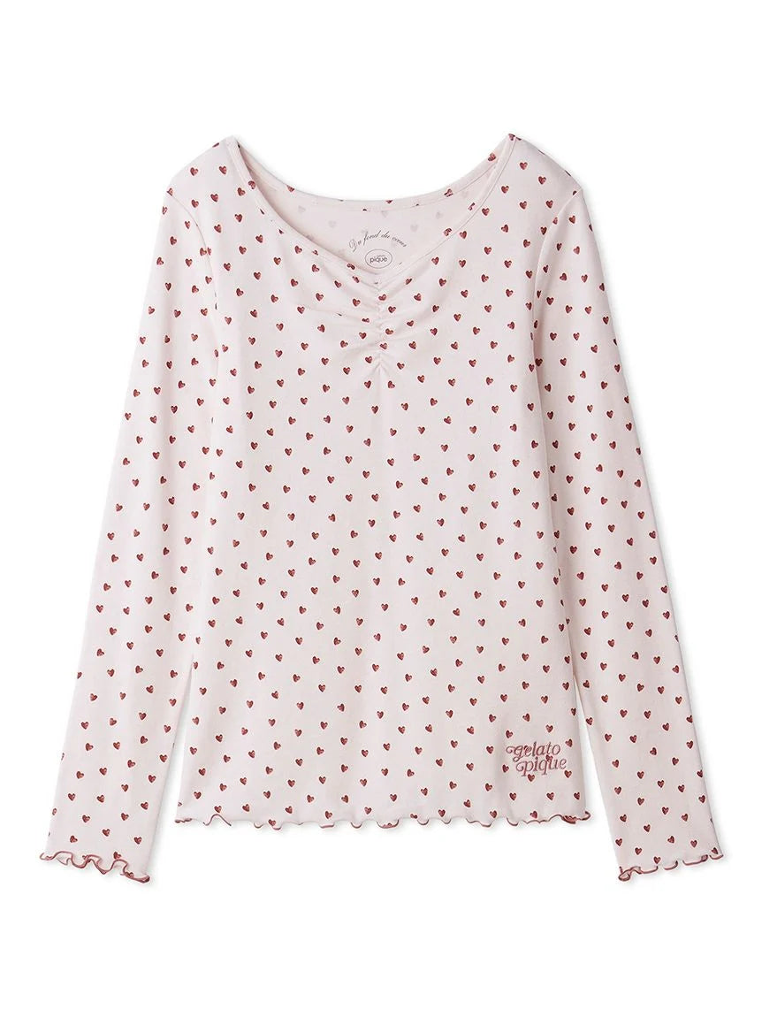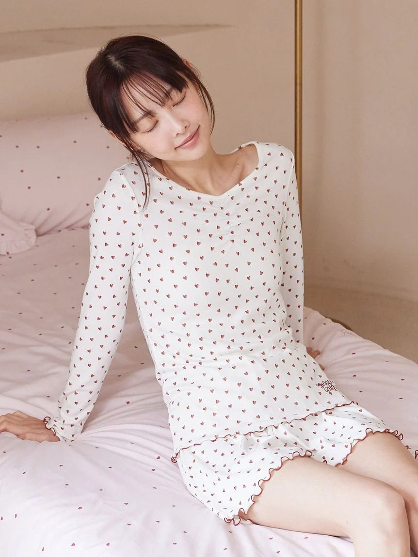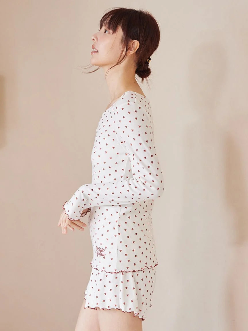 This ribbed knit pullover is designed with the concept of "making your heart flutter," evoking the feeling of spring. Small hearts are scattered randomly like topping flakes, and there is a subtle shirring at the chest. The cuffs and hem have merrow stitching, and the logo embroidery on the lower left front is also a cute finish. It can be worn not only as loungewear but also as an inner layer. Available in two colors: off-white and pink, enjoy coordinating it with the shorts and accessories from the same series.