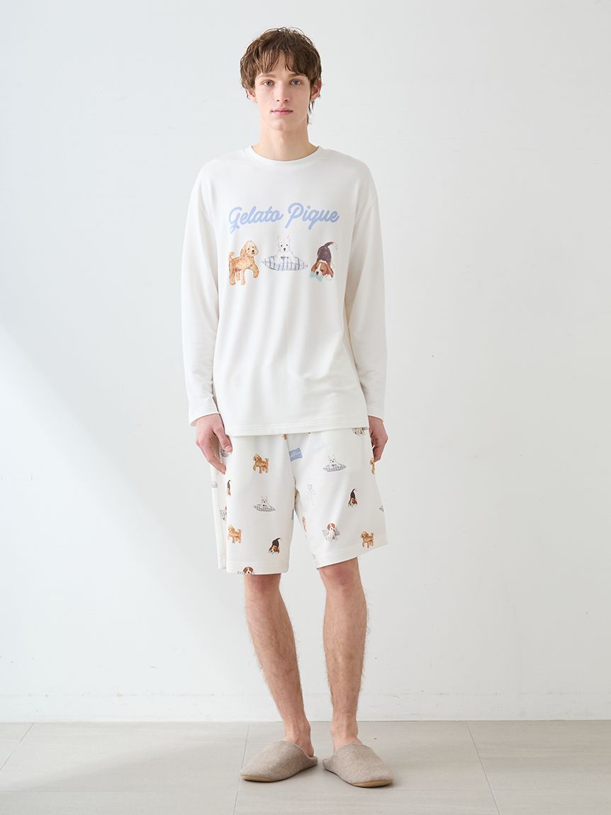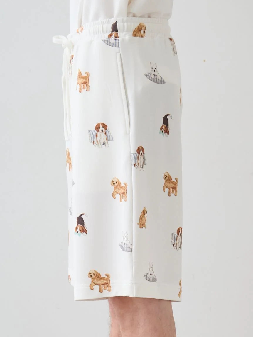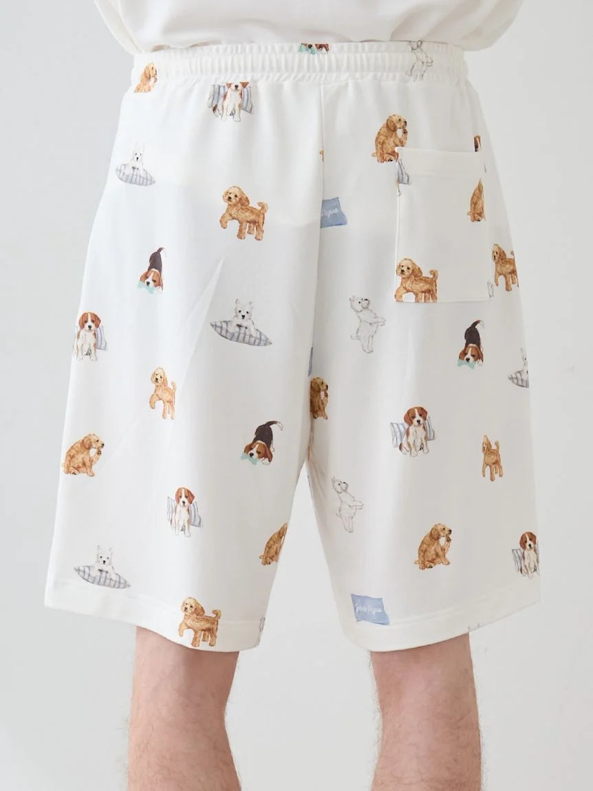 Beagles, Labradoodles, and Westies. This unisex series features a theme of dogs having fun playing around the house. These shorts feature an all-over print of three expressive dogs in the inlay material. The subtle border-patterned pillow, a signature feature of gelato pique, adds a touch of style. Pockets are located on both sides and the back right, and the length is relaxed and comfortable for both men and women. Available in two refreshing colors: off-white and gray. Pair them with the matching one-point long-sleeved T-shirt from the same series, or create a perfect matching outfit for couples.