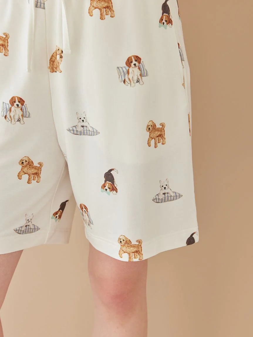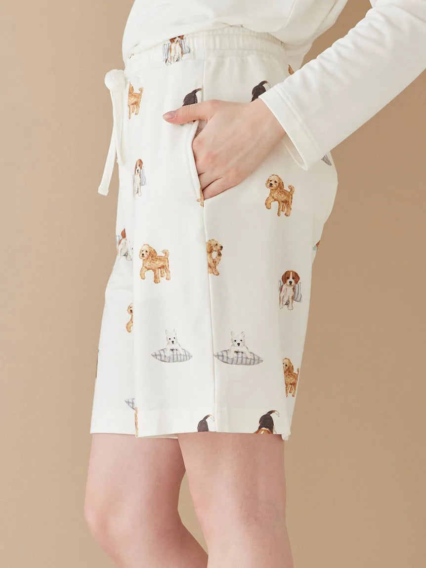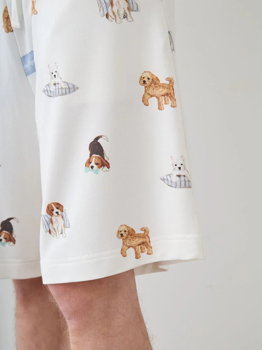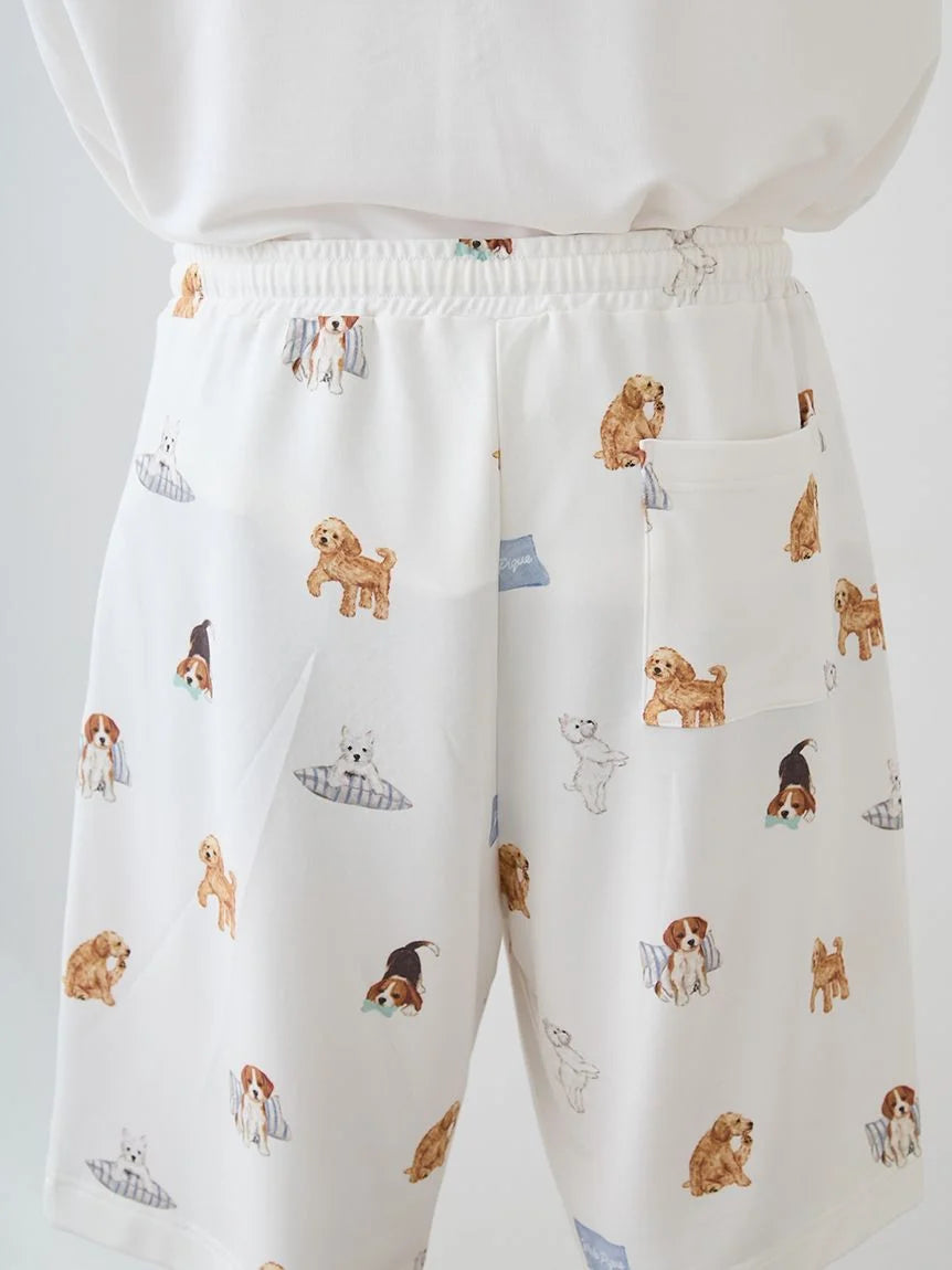 Beagles, Labradoodles, and Westies. This unisex series features a theme of dogs having fun playing around the house. These shorts feature an all-over print of three expressive dogs in the inlay material. The subtle border-patterned pillow, a signature feature of gelato pique, adds a touch of style. Pockets are located on both sides and the back right, and the length is relaxed and comfortable for both men and women. Available in two refreshing colors: off-white and gray. Pair them with the matching one-point long-sleeved T-shirt from the same series, or create a perfect matching outfit for couples.