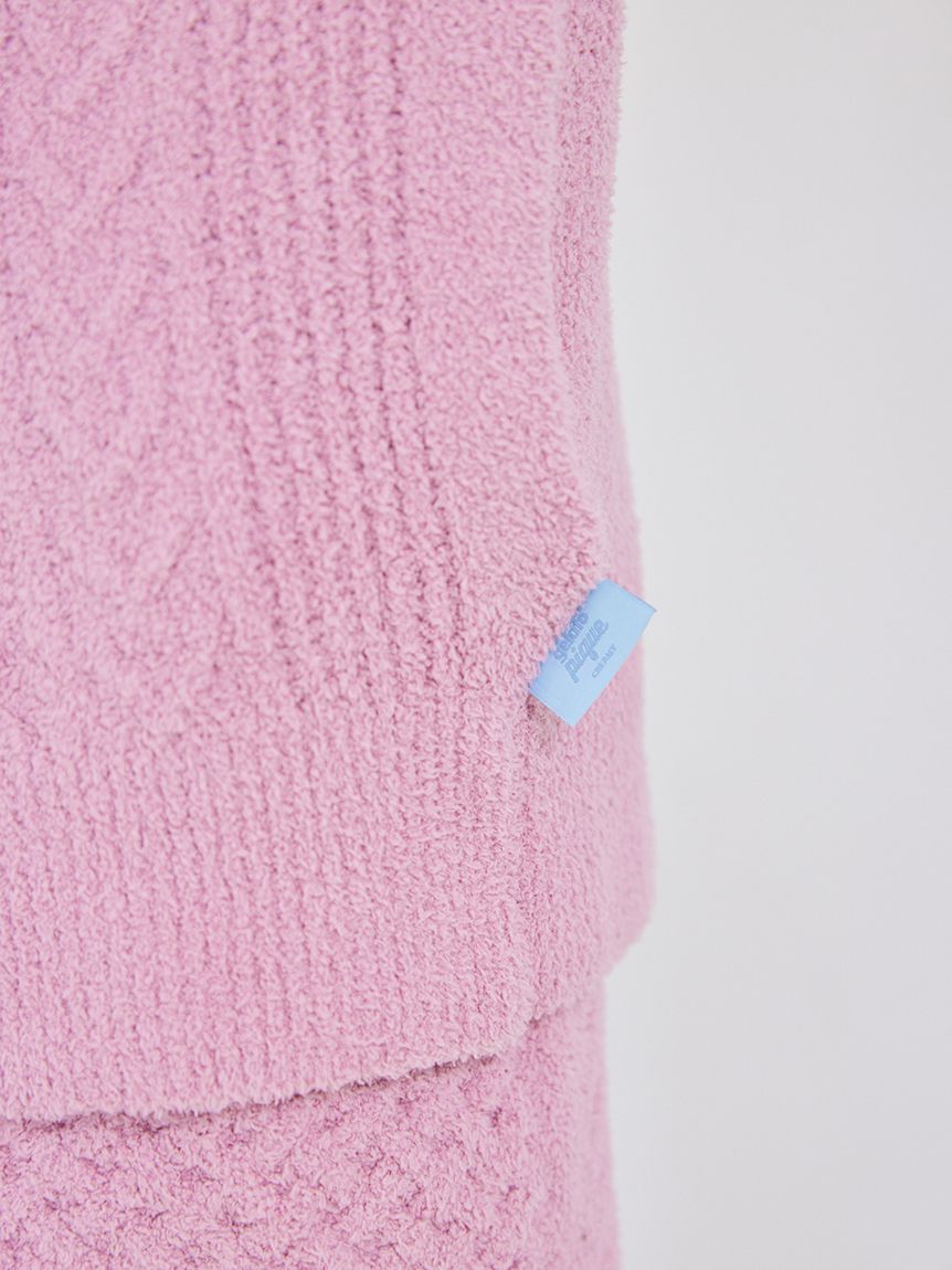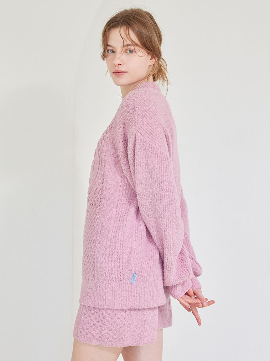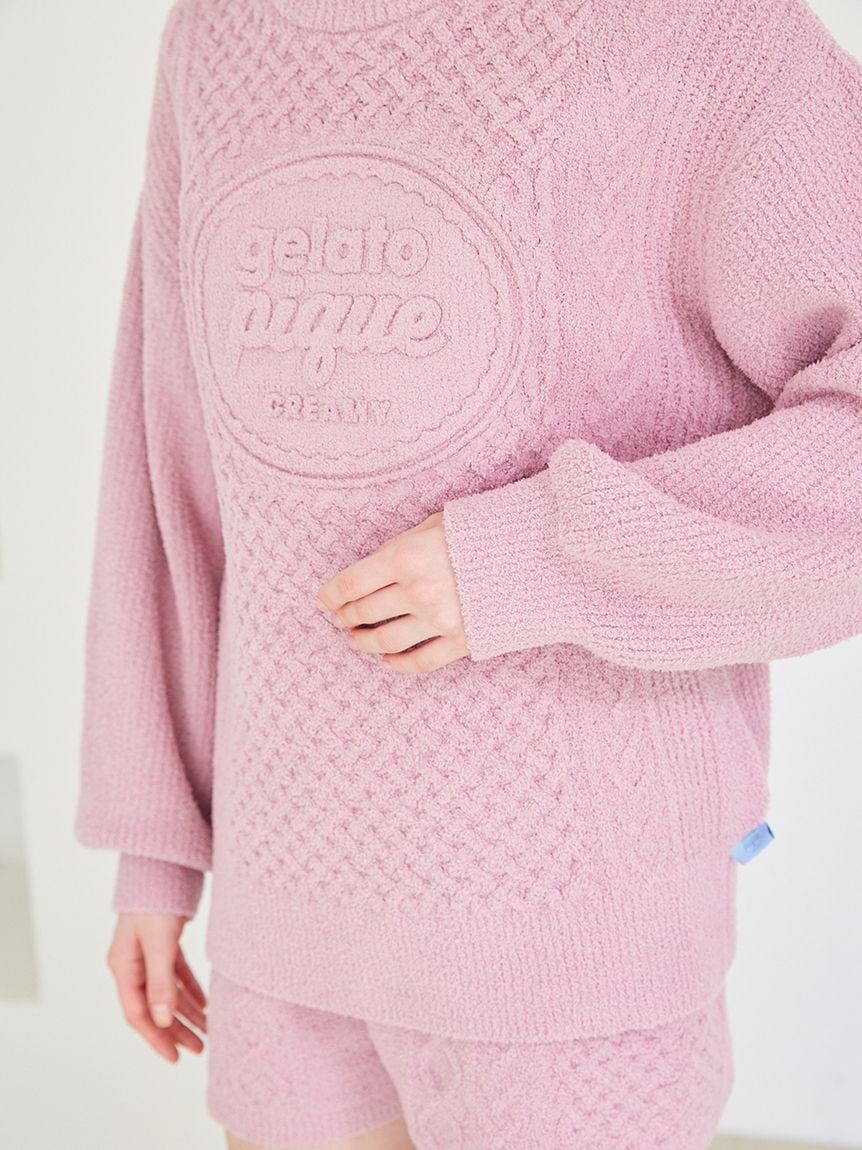 The 2026 Valentine's Day collection is filled with sweet motifs, such as ice cream and bears, characteristic of gelato pique. This Aran-patterned pullover is crafted from Airy Moco fabric, with a warm, three-dimensional knit pattern. The front features an embossed logo reminiscent of a cookie sandwiching an ice cream sandwich. The sides and sleeves feature different knit patterns, creating a rich, expressive knitwear. Enjoy the lightweight, enveloping comfort of Airy Moco. Available in two colors, pink and blue. We recommend pairing it with the Aran-patterned bottoms or one-point pullover from the same series, or pairing it with the HOMME size.