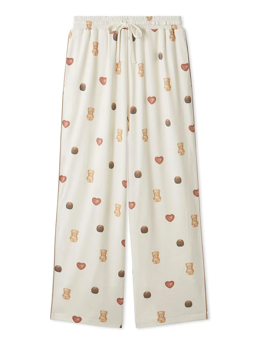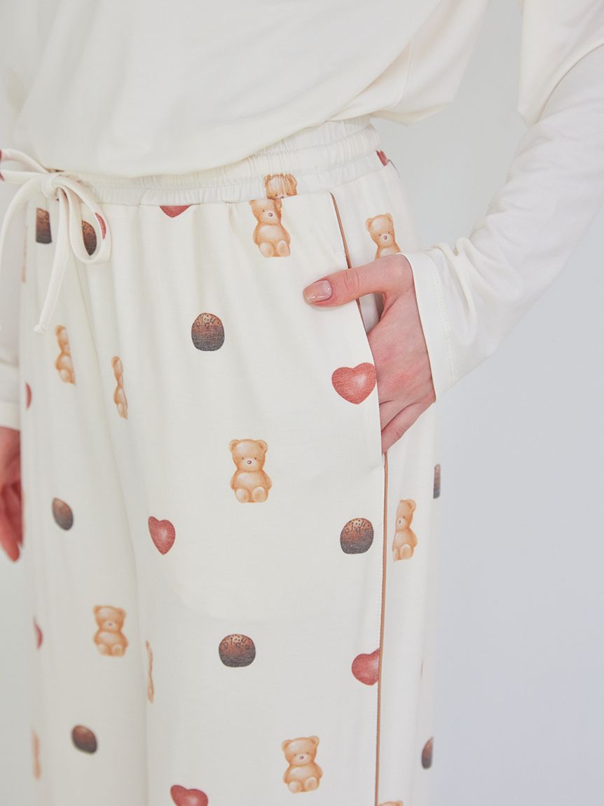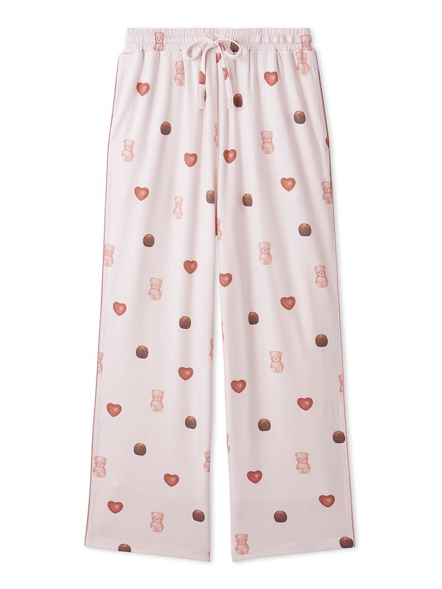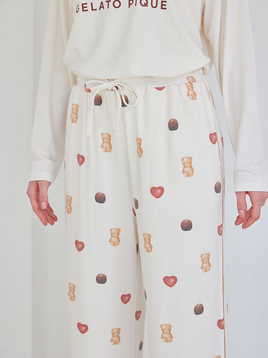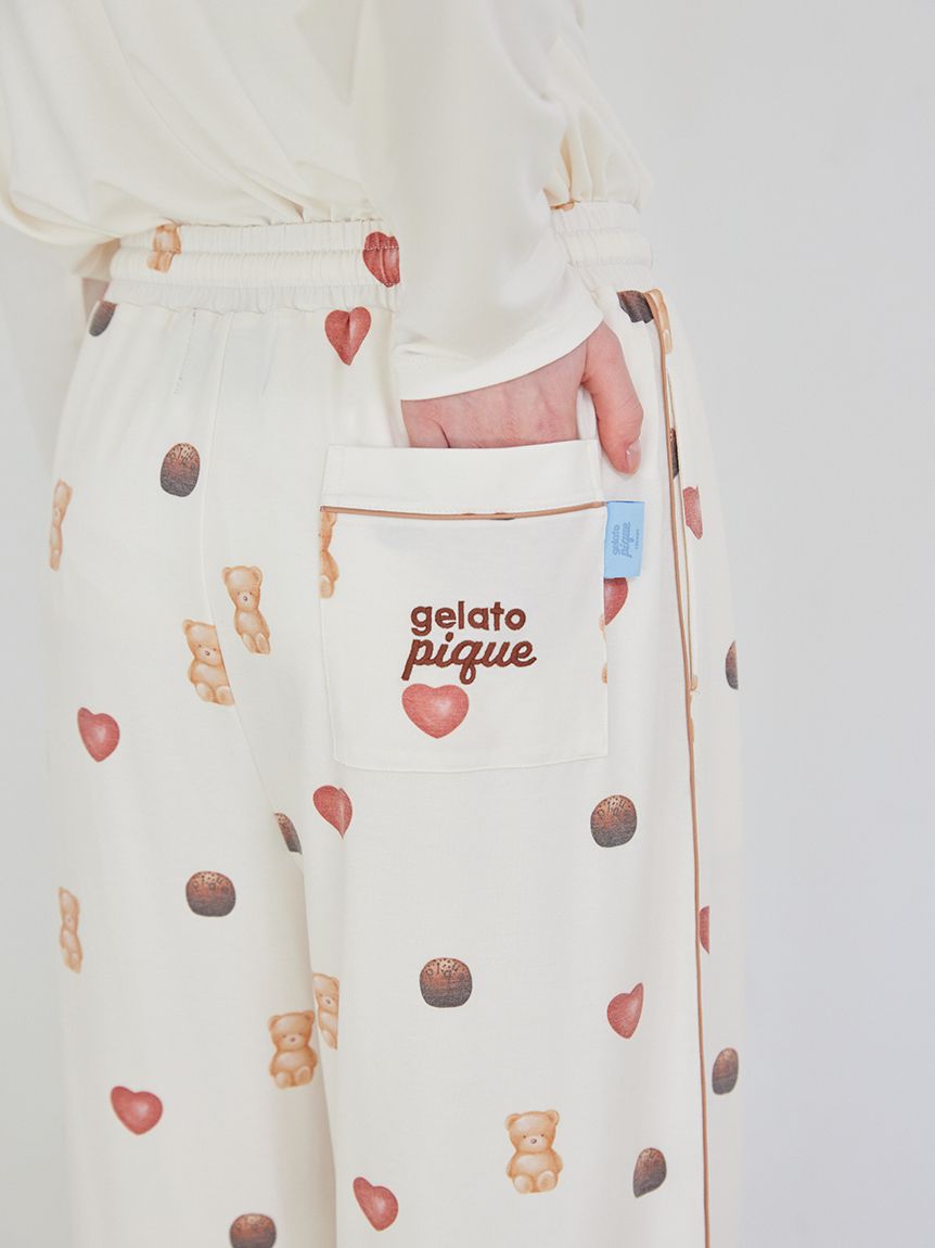 The 2026 Valentine's Day collection features sweet motifs, such as ice cream and bears, characteristic of gelato pique. These long pants feature a Valentine's Day-themed all-over print featuring bear, heart-shaped ice cream, and chocolate-flavored ice cream. They feature contrasting piping, side pockets, and an embroidered logo on the back right pocket. Made from a smooth rayon-blend knit fabric, they're perfect for all seasons. Available in soft cream and pink, pair this item with the all-over print long pants or Aran print items from the same series, or pair with the HOMME size for a coordinating look.