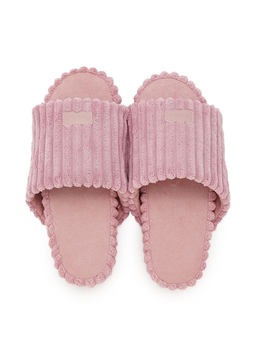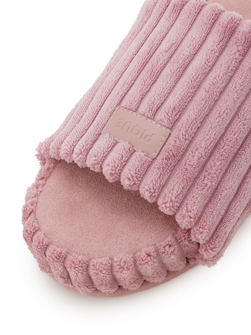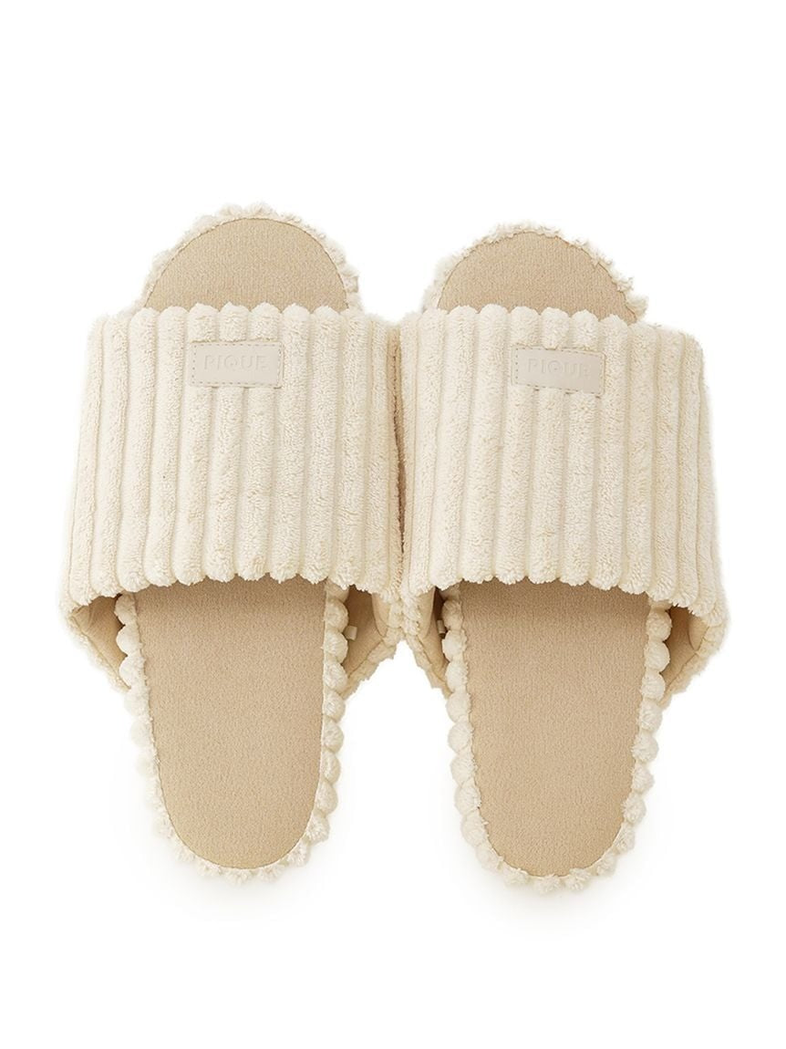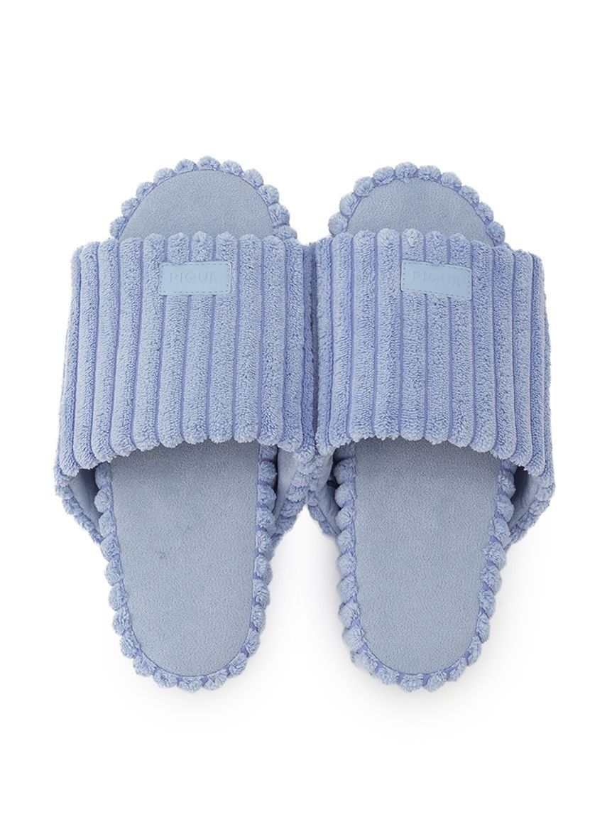 These room shoes feature a wide-ribbed material with a soft, fluffy texture that feels so comfortable. They come in Gelato Pique's signature soft color palette and include a resin plate with the PIQUE logo. The open-toe sandal style prevents sweat, while the thick sole subtly enhances your height. Available in three colors: Ivory, Pink, and Blue. This item is perfect for daily use indoor or as a gift.